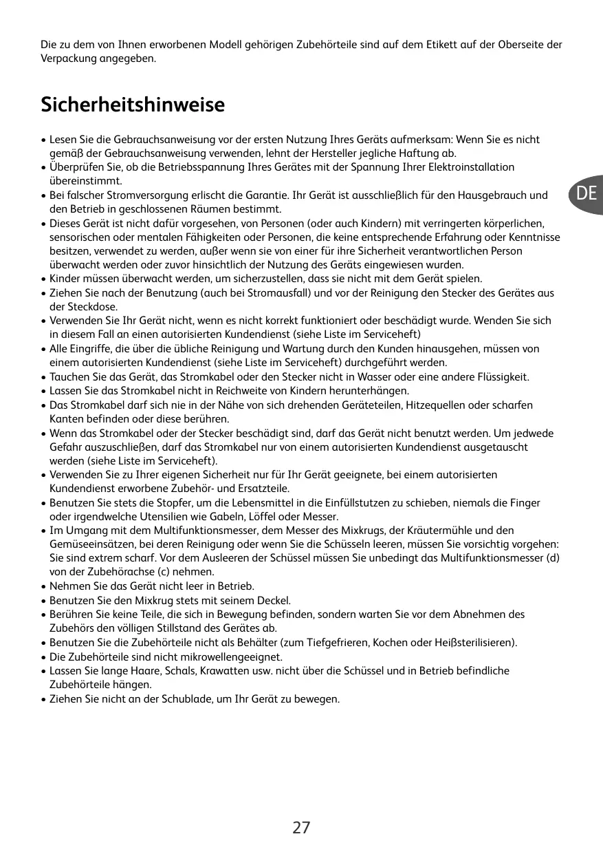 • Lisez attentivement le mode d’emploi avant la première utilisation de votre appareil : une utilisation non conforme au mode d’emploi dégagerait le fabricant de toute responsabilité. • Vérifiez que la tension d’alimentation de votre appareil correspond bien à celle de votre installation électrique. • Toute erreur de branchement annule la garantie. Votre appareil est destiné à un usage domestique à l’intérieur de la maison. • Cet appareil n'est pas prévu pour être utilisé par des personnes (y compris les enfants), dont les capacités physiques, sensorielles ou mentales sont réduites, ou des personnes dénuées d'expérience ou de connaissance, sauf si elles ont pu bénéficier, par l'intermédiaire d'une personne responsable de leur sécurité, d'une surveillance ou d'instructions préalables concernant l'utilisation de l'appareil. • Il convient de surveiller les enfants pour s’assurer qu’ils ne jouent pas avec l’appareil. • Débranchez votre appareil dès que vous cessez de l’utiliser (même en cas de coupure de courant) et lorsque vous le nettoyez. • N’utilisez pas votre appareil s’il ne fonctionne pas correctement ou s’il a été endommagé. Dans ce cas, adressez-vous à un centre agréé (voir liste dans le livret service). • Toute intervention autre que le nettoyage et l’entretien usuel par le client doit être effectuée par un centre agréé (voir liste dans le livret service). • Ne mettez pas l’appareil, le câble d’alimentation ou la fiche, dans l’eau ou tout autre liquide. • Ne laissez pas pendre le câble d’alimentation à portée de mains des enfants. • Le câble d’alimentation ne doit jamais être à proximité ou en contact avec les parties chaudes de votre appareil, près d’une source de chaleur ou sur un angle vif. • Si le câble d’alimentation ou la fiche sont endommagés, n’utilisez pas l’appareil. Afin d’éviter tout danger, faites-les obligatoirement remplacer par un centre agréé (voir liste dans le livret service). • Pour votre sécurité, n’utilisez que des accessoires et des pièces détachées adaptés à votre appareil, vendu en centre agréé. • Utilisez toujours les poussoirs pour guider les aliments dans les cheminées, jamais les doigts, ni une fourchette, une cuillère, un couteau ou tout autre objet. • Des précautions doivent être prises lors de la manipulation du couteau multifonction, du couteau du bol mixer, moulin fines-herbes et des cartouches coupe-légumes, lorsque vous les nettoyez et lorsque vous videz les bols, ils sont extrêmement tranchants. Vous devez obligatoirement retirer le couteau multifonction (d) par son entraîneur (c) avant de vider le bol de son contenu. • N’utilisez pas votre appareil à vide. • Utilisez toujours votre bol mixer avec son couvercle. • Ne touchez jamais les pièces en mouvement, attendez l’arrêt complet avant d’enlever les accessoires. • N’utilisez pas les accessoires comme récipient (congélation – cuisson – stérilisation à chaud). • Ne passez pas les accessoires dans un four à micro-ondes. • Ne laissez pas pendre les cheveux longs, les écharpes, les cravates, etc… au dessus du bol et des accessoires en fonctionnement. • Ne déplacez pas votre appareil en le tenant par le tiroir.