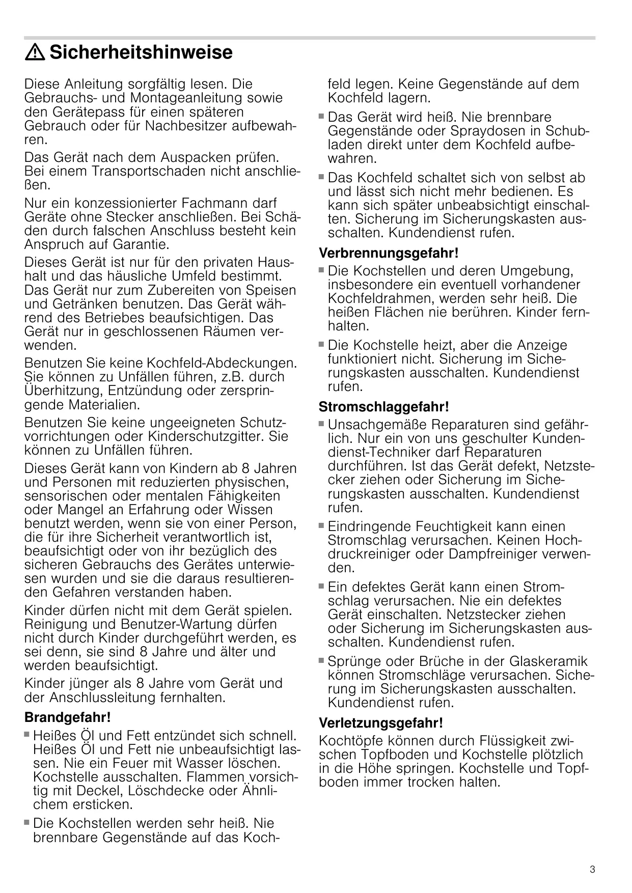Benutzen Sie keine Kochfeld-Abdeckungen. Sie können zu Unfällen führen, z.B. durch Überhitzung, Entzündung oder zersprin-gende Materialien.