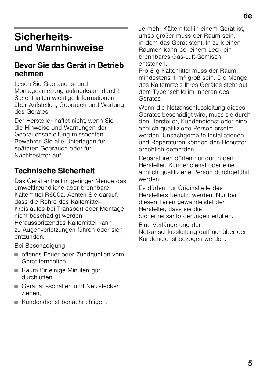 deInhaltsverzeichnisdeGebrauchsanleitung Sicherheitsund Warnhinweise Bevor Sie das Gerät in Betrieb nehmen Lesen Sie Gebrauchs- und Montageanleitung aufmerksam durch! Sie enthalten wichtige Informationen über Aufstellen, Gebrauch und Wartung des Gerätes. Der Hersteller haftet nicht, wenn Sie die Hinweise und Warnungen der Gebrauchsanleitung missachten. Bewahren Sie alle Unterlagen für späteren Gebrauch oder für Nachbesitzer auf. Technische Sicherheit Das Gerät enthält in geringer Menge das umweltfreundliche aber brennbare Kältemittel R600a. Achten Sie darauf, dass die Rohre des KältemittelKreislaufes bei Transport oder Montage nicht beschädigt werden. Herausspritzendes Kältemittel kann zu Augenverletzungen führen oder sich entzünden. Bei Beschädigung ■ offenes Feuer oder Zündquellen vom Gerät fernhalten, ■ Raum für einige Minuten gut durchlüften, ■ Gerät ausschalten und Netzstecker ziehen, ■ Kundendienst benachrichtigen. Je mehr Kältemittel in einem Gerät ist, umso größer muss der Raum sein, in dem das Gerät steht. In zu kleinen Räumen kann bei einem Leck ein brennbares Gas-Luft-Gemisch entstehen. Pro 8 g Kältemittel muss der Raum mindestens 1 m³ groß sein. Die Menge des Kältemittels Ihres Gerätes steht auf dem Typenschild im Inneren des Gerätes. Wenn die Netzanschlussleitung dieses Gerätes beschädigt wird, muss sie durch den Hersteller, Kundendienst oder eine ähnlich qualifizierte Person ersetzt werden. Unsachgemäße Installationen und Reparaturen können den Benutzer erheblich gefährden. Reparaturen dürfen nur durch den Hersteller, Kundendienst oder eine ähnlich qualifizierte Person durchgeführt werden. Es dürfen nur Originalteile des Herstellers benutzt werden. Nur bei diesen Teilen gewährleistet der Hersteller, dass sie die Sicherheitsanforderungen erfüllen. Eine Verlängerung der Netzanschlussleitung darf nur über den Kundendienst bezogen werden.