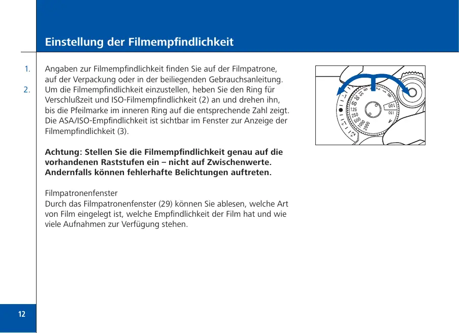 Achtung: Stellen Sie die Filmempfindlichkeit einzel auf die vorhandenen Raststufen ein - nicht auf Zwischenwerte. Andernfalls konnen fehlerhafte Belichtungen auftreten.