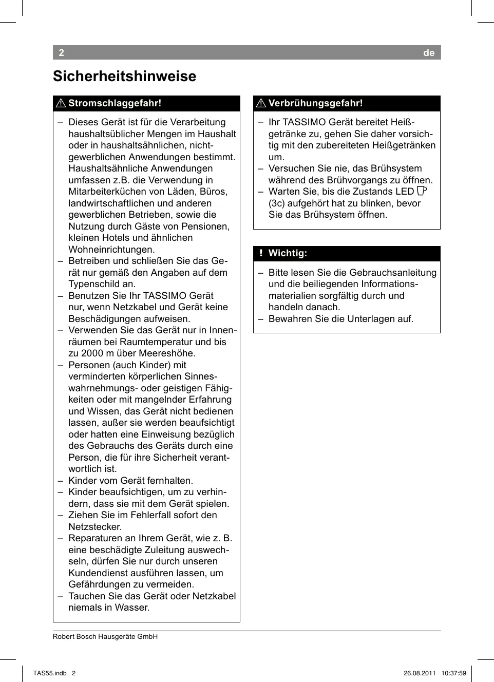 Sicherheitshinweise ¡ Stromschlaggefahr! ¡ Verbrühungsgefahr! – Dieses Gerät ist für die Verarbeitung haushaltsüblicher Mengen im Haushalt oder in haushaltsähnlichen, nicht gewerblichen Anwendungen bestimmt. Haushaltsähnliche Anwendungen umfassen z.B. die Verwendung in Mitarbeiterküchen von Läden, Büros, landwirtschaftlichen und anderen gewerblichen Betrieben, sowie die Nutzung durch Gäste von Pensionen, kleinen Hotels und ähnlichen Wohneinrichtungen. – Betreiben und schließen Sie das Ge rät nur gemäß den Angaben auf dem Typenschild an. – Benutzen Sie Ihr TASSIMO Gerät nur, wenn Netzkabel und Gerät keine Beschädigungen aufweisen. – Verwenden Sie das Gerät nur in Innen räumen bei Raumtemperatur und bis zu 2000 m über Meereshöhe. – Personen (auch Kinder) mit verminder ten körperlichen Sinnes wahrnehmungs oder geistigen Fähig keiten oder mit mangelnder Erfahrung und Wissen, das Gerät nicht bedienen lassen, außer sie werden beaufsichtigt oder hatten eine Einweisung bezüglich des Gebrauchs des Geräts durch eine Person, die für ihre Sicherheit verant wortlich ist. – Kinder vom Gerät fernhalten. – Kinder beaufsichtigen, um zu verhin dern, dass sie mit dem Gerät spielen. – Ziehen Sie im Fehlerfall sofort den Netzstecker. – Reparaturen an Ihrem Gerät, wie z. B. eine beschädigte Zuleitung auswech seln, dür fen Sie nur durch unseren Kundendienst ausführen lassen, um Gefährdungen zu vermeiden. – Tauchen Sie das Gerät oder Netzkabel niemals in Wasser. – Ihr TASSIMO Gerät bereitet Heiß getränke zu, gehen Sie daher vorsich tig mit den zubereiteten Heißgetränken um. – Versuchen Sie nie, das Brühsystem während des Brühvorgangs zu öffnen. – Warten Sie, bis die Zustands LED F (3c) aufgehört hat zu blinken, bevor Sie das Brühsystem öffnen. !! Wichtig: – Bitte lesen Sie die Gebrauchsanleitung und die beiliegenden Informations materialien sorgfältig durch und handeln danach. – Bewahren Sie die Unterlagen auf. Robert Bosch Hausgeräte GmbH TAS55.indb 2