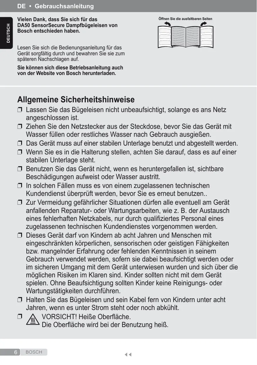 DEUTSCH Vielen Dank, dass Sie sich für das DA50 SensorSecure Dampfbügeleisen von Bosch entschieden haben.