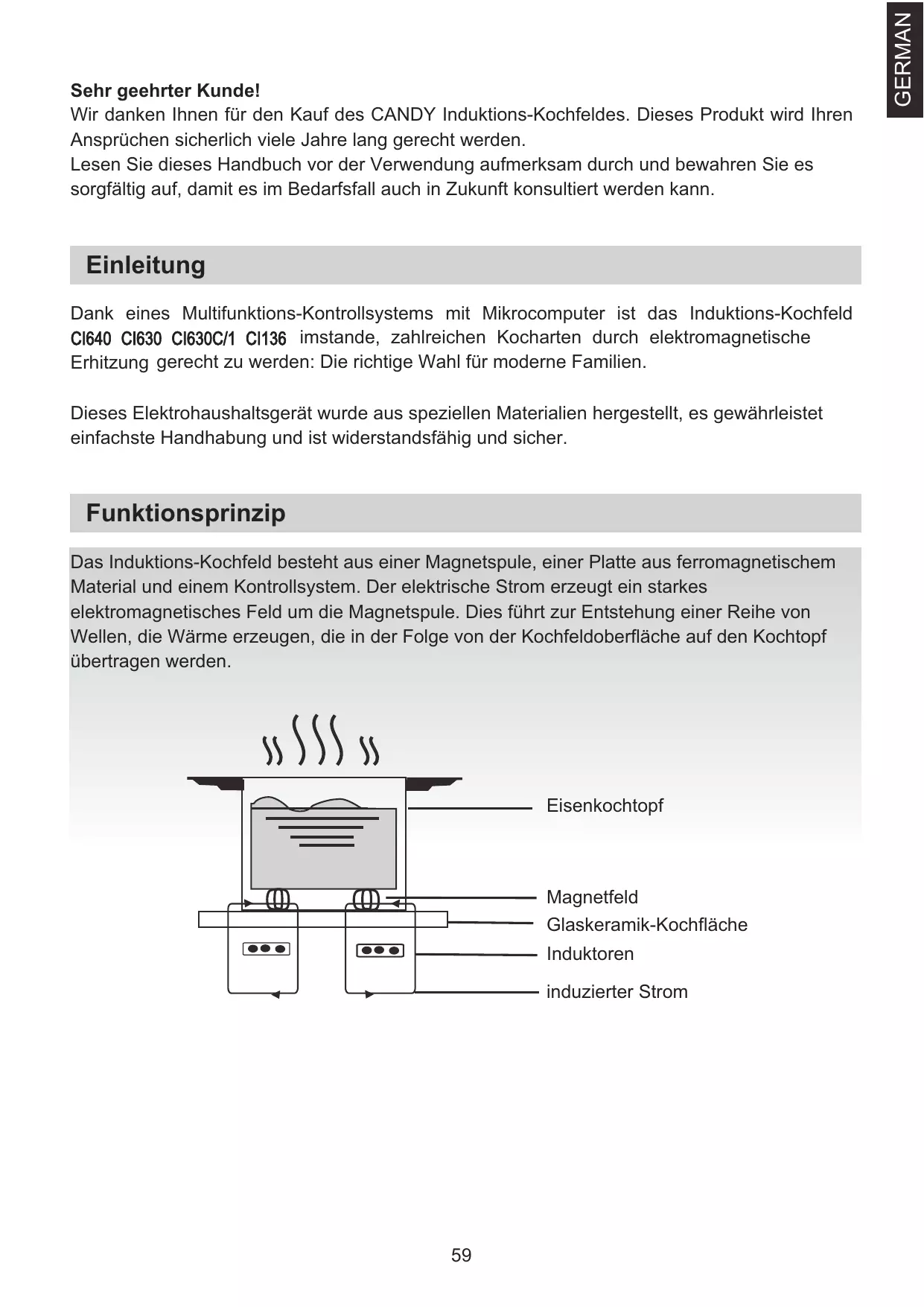 GERMAN Sehr geehrter Kunde! Wir danken Ihnen für den Kauf des CANDY Induktions-Kochfeldes. Dieses Produkt wird Ihren Ansprüchen sicherlich viele Jahre lang gerecht werden. Lesen Sie dieses Handbuch vor der Verwendung aufmerksam durch und bewahren Sie es sorgfältig auf, damit es im Bedarfsfall auch in Zukunft konsultiert werden kann. Sicherheit Installation Dieses Kochfeld wurde für die Verwendung im Haushalt entwickelt. Wir legen stets größten Wert darauf, unsere Produkte zu verbessern und behalten uns das Recht vor, infolge neuer technischer Entwicklungen Änderungen vorzunehmen. Vorgangsweise bei der Installation