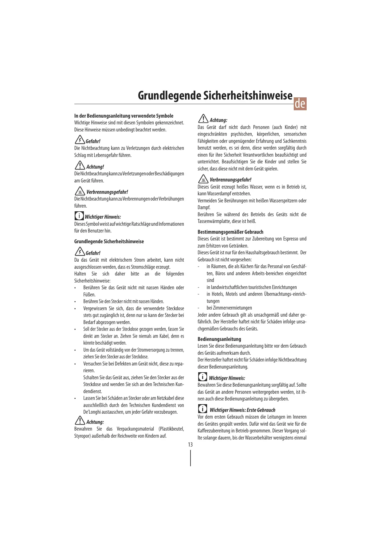 Achtung: Das Gerät darf nicht durch Personen (auch Kinder) mit eingeschränkten psychischen, körperlichen, sensorischen Fähigkeiten oder ungenügender Erfahrung und Sachkenntnis benutzt werden, es sei denn, diese werden sorgfältig durch einen für ihre Sicherheit Verantwortlichen beaufsichtigt und unterrichtet. Beaufsichtigen Sie die Kinder und stellen Sie sicher, dass diese nicht mit dem Gerät spielen. Gefahr! Die Nichtbeachtung kann zu Verletzungen durch elektrischen Schlag mit Lebensgefahr führen. Achtung! Die Nichtbeachtung kann zuVerletzungen oder Beschädigungen am Gerät führen. Verbrennungsgefahr! Dieses Gerät erzeugt heißes Wasser, wenn es in Betrieb ist, kann Wasserdampf entstehen. Vermeiden Sie Berührungen mit heißen Wasserspritzern oder Dampf. Berühren Sie während des Betriebs des Geräts nicht die Tassenwärmplatte, diese ist heiß. Verbrennungsgefahr! Die Nichtbeachtung kann zu Verbrennungen oder Verbrühungen führen. Wichtiger Hinweis: Dieses Symbol weist auf wichtige Ratschläge und Informationen für den Benutzer hin. Bestimmungsgemäßer Gebrauch Dieses Gerät ist bestimmt zur Zubereitung von Espresso und zum Erhitzen von Getränken. Dieses Gerät ist nur für den Haushaltsgebrauch bestimmt. Der Gebrauch ist nicht vorgesehen: - in Räumen, die als Küchen für das Personal von Geschäften, Büros und anderen Arbeits-bereichen eingerichtet sind - in landwirtschaftlichen touristischen Einrichtungen - in Hotels, Motels und anderen Übernachtungs-einrichtungen - bei Zimmervermietungen Jeder andere Gebrauch gilt als unsachgemäß und daher gefährlich. Der Hersteller haftet nicht für Schäden infolge unsachgemäßen Gebrauchs des Geräts. Grundlegende Sicherheitshinweise Gefahr! Da das Gerät mit elektrischem Strom arbeitet, kann nicht ausgeschlossen werden, dass es Stromschläge erzeugt. Halten Sie sich daher bitte an die folgenden Sicherheitshinweise: t Berühren Sie das Gerät nicht mit nassen Händen oder Füßen. t Berühren Sie den Stecker nicht mit nassen Händen. t 7FSHFXJTTFSO 4JF TJDI EBTT EJF WFSXFOEFUF 4UFDLEPTF stets gut zugänglich ist, denn nur so kann der Stecker bei Bedarf abgezogen werden. t Soll der Stecker aus der Steckdose gezogen werden, fassen Sie direkt am Stecker an. Ziehen Sie niemals am Kabel, denn es könnte beschädigt werden. t Um das Gerät vollständig von der Stromversorgung zu trennen, ziehen Sie den Stecker aus der Steckdose. t 7FSTVDIFO4JFCFJ%FGFLUFOBN(FSÊUOJDIU EJFTF[VSFQBrieren. Schalten Sie das Gerät aus, ziehen Sie den Stecker aus der Steckdose und wenden Sie sich an den Technischen Kundendienst. t Lassen Sie bei Schäden an Stecker oder am Netzkabel diese ausschließlich durch den Technischen Kundendienst von De’Longhi austauschen, um jeder Gefahr vorzubeugen. Bedienungsanleitung Lesen Sie diese Bedienungsanleitung bitte vor dem Gebrauch des Geräts aufmerksam durch. Der Hersteller haftet nicht für Schäden infolge Nichtbeachtung dieser Bedienungsanleitung. Wichtiger Hinweis: Bewahren Sie diese Bedienungsanleitung sorgfältig auf. Sollte das Gerät an andere Personen weitergegeben werden, ist ihnen auch diese Bedienungsanleitung zu übergeben. Wichtiger Hinweis: Erste Gebrauch Vor dem ersten Gebrauch müssen die Leitungen im Inneren des Gerätes gespült werden. Dafür wird das Gerät wie für die Kaffeezubereitung in Betrieb genommen. Dieser Vorgang sollte solange dauern, bis der Wasserbehälter wenigstens einmal Achtung: Bewahren Sie das Verpackungsmaterial (Plastikbeutel, Styropor) außerhalb der Reichweite von Kindern auf.