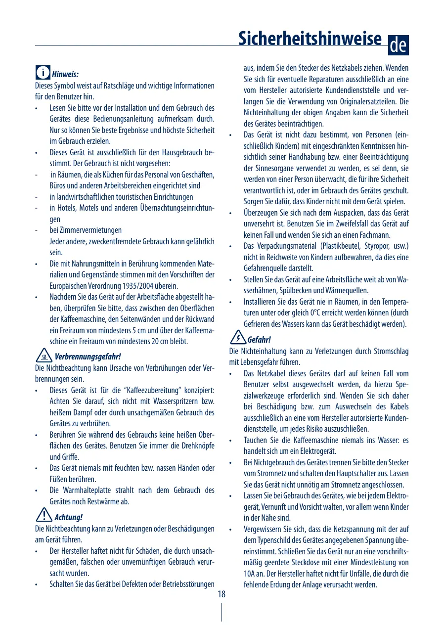 Le non-respect de ces recommandations peut entraîner un risque de brûlures. • Cet appareil est conçu pour faire du café: les projections d’eau et de vapeur ou une mauvaise utilisation de l’appareil peuvent provoquer des brûlures. • Pendant l’utilisation ne pas toucher les surfaces chaudes de l’appareil. Utiliser les poignées ou les manches. • Ne pas toucher l’appareil les mains ou les pieds mouillés ou humides. • La plaque chauffante reste chaude après l’utilisation de l’appareil. Attention! Le non-respect de ces recommandations peut entraîner des blessures ou des dommages à l’appareil. • Le fabricant ne peut être tenu pour responsable des dommages dus à une utilisation anormale, non conforme ou déraisonnable. • En cas de panne ou de mauvais fonctionnement éteignez l’appareil et débranchez la fiche de la prise. Pour toute réparation, adressez-vous exclusivement à un Centre de service agréé par le Fabricant et exigez des pièces détachées d’origine. Le non-respect de ces recommandations peut compromettre la sécurité de l’appareil.
