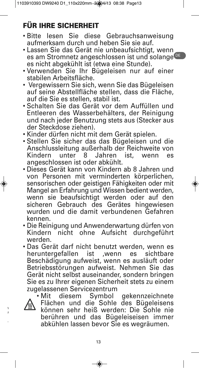 FÜR IHRE SICHERHEIT • Bitte lesen Sie diese Gebrauchsanweisung aufmerksam durch und heben Sie sie auf. • Lassen Sie das Gerät nie unbeaufsichtigt, wenn es am Stromnetz angeschlossen ist und solange DE es nicht abgekühlt ist (etwa eine Stunde). • Verwenden Sie Ihr Bügeleisen nur auf einer stabilen Arbeitsfläche. • Vergewissern Sie sich, wenn Sie das Bügeleisen auf seine Abstellfläche stellen, dass die Fläche, auf die Sie es stellen, stabil ist. • Schalten Sie das Gerät vor dem Auffüllen und Entleeren des Wasserbehälters, der Reinigung und nach jeder Benutzung stets aus (Stecker aus der Steckdose ziehen). • Kinder dürfen nicht mit dem Gerät spielen. • Stellen Sie sicher das das Bügeleisen und die Anschlussleitung außerhalb der Reichweite von Kindern unter 8 Jahren ist, wenn es angeschlossen ist oder abkühlt. • Dieses Gerät kann von Kindern ab 8 Jahren und von Personen mit verminderten körperlichen, sensorischen oder geistigen Fähigkeiten oder mit Mangel an Erfahrung und Wissen bedient werden, wenn sie beaufsichtigt werden oder auf den sicheren Gebrauch des Gerätes hingewiesen wurden und die damit verbundenen Gefahren kennen. • Die Reinigung und Anwenderwartung dürfen von Kindern nicht ohne Aufsicht durchgeführt werden. • Das Gerät darf nicht benutzt werden, wenn es heruntergefallen ist ,wenn es sichtbare Beschädigung aufweist, wenn es ausläuft oder Betriebsstörungen aufweist. Nehmen Sie das Gerät nicht selbst auseinander, sondern bringen Sie es zu Ihrer eigenen Sicherheit stets zu einem zugelassenen Servicezentrum • Mit diesem Symbol gekennzeichnete Flächen und die Sohle des Bügeleisens können sehr heiß werden: Die Sohle nie berühren und das Bügeleiseisen immer abkühlen lassen bevor Sie es wegräumen. 13
