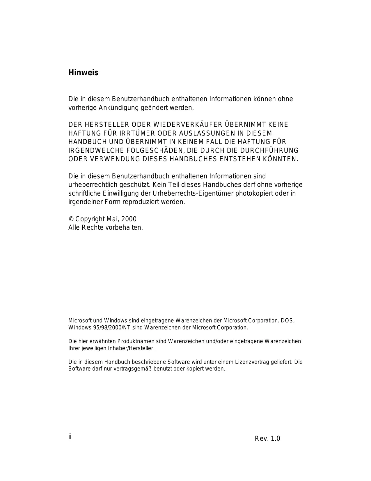 Hinweis Die in diesem Benutzerhandbuch enthaltenen Informationen können ohne vorherige Ankündigung geändert werden. DER HERSTELLER ODER WIEDERVERKÄUFER ÜBERNIMMT KEINE HAFTUNG FÜR IRRTÜMER ODER AUSLASSUNGEN IN DIESEM HANDBUCH UND ÜBERNIMMT IN KEINEM FALL DIE HAFTUNG FÜR IRGENDWELCHE FOLGESCHÄDEN, DIE DURCH DIE DURCHFÜHRUNG ODER VERWENDUNG DIESES HANDBUCHES ENTSTEHEN KÖNNTEN. Die in diesem Benutzerhandbuch enthaltenen Informationen sind urheberrechtlich geschützt. Kein Teil dieses Handbuches darf ohne vorherige schriftliche Einwilligung der Urheberrechts-Eigentümer photokopiert oder in irgendeiner Form reproduziert werden. © Copyright Mai, 2000 Alle Rechte vorbehalten. Microsoft und Windows sind eingetragene Warenzeichen der Microsoft Corporation. DOS, Windows 95/98/2000/NT sind Warenzeichen der Microsoft Corporation. Die hier erwähnten Produktnamen sind Warenzeichen und/oder eingetragene Warenzeichen Ihrer jeweiligen Inhaber/Hersteller. Die in diesem Handbuch beschriebene Software wird unter einem Lizenzvertrag geliefert. Die Software darf nur vertragsgemäß benutzt oder kopiert werden.