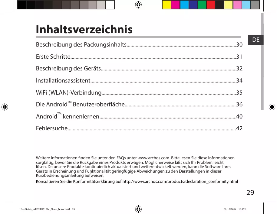 Laden Sie die Anleitung für Ihr Tablet kostenlos im PDF-Format! Finden Sie Ihr Handbuch 101C NEON - ARCHOS und nehmen Sie Ihr elektronisches Gerät wieder in die Hand. Auf dieser Seite sind alle Dokumente veröffentlicht, die für die Verwendung Ihres Geräts notwendig sind. 101C NEON von der Marke ARCHOS.