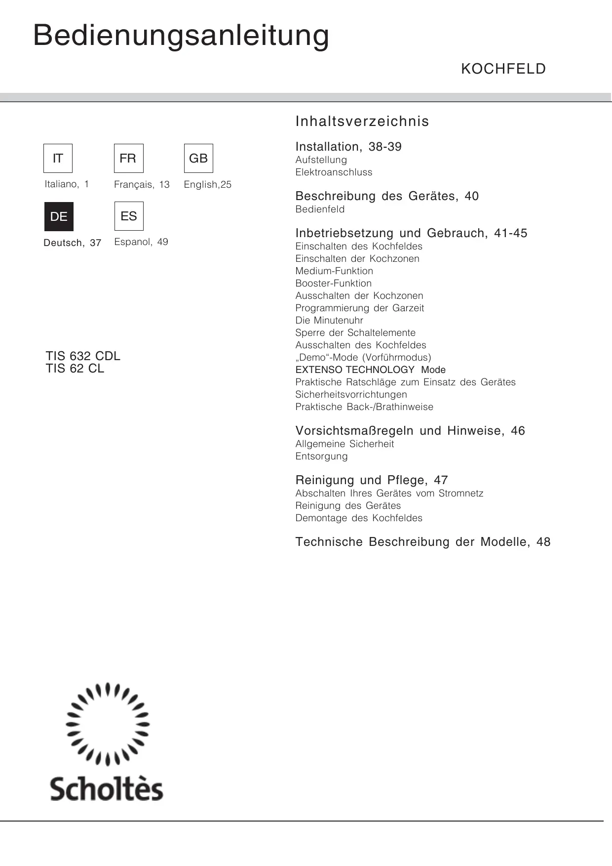 TIS 62 CL - Kochfeld SCHOLTES - Kostenlose Bedienungsanleitung