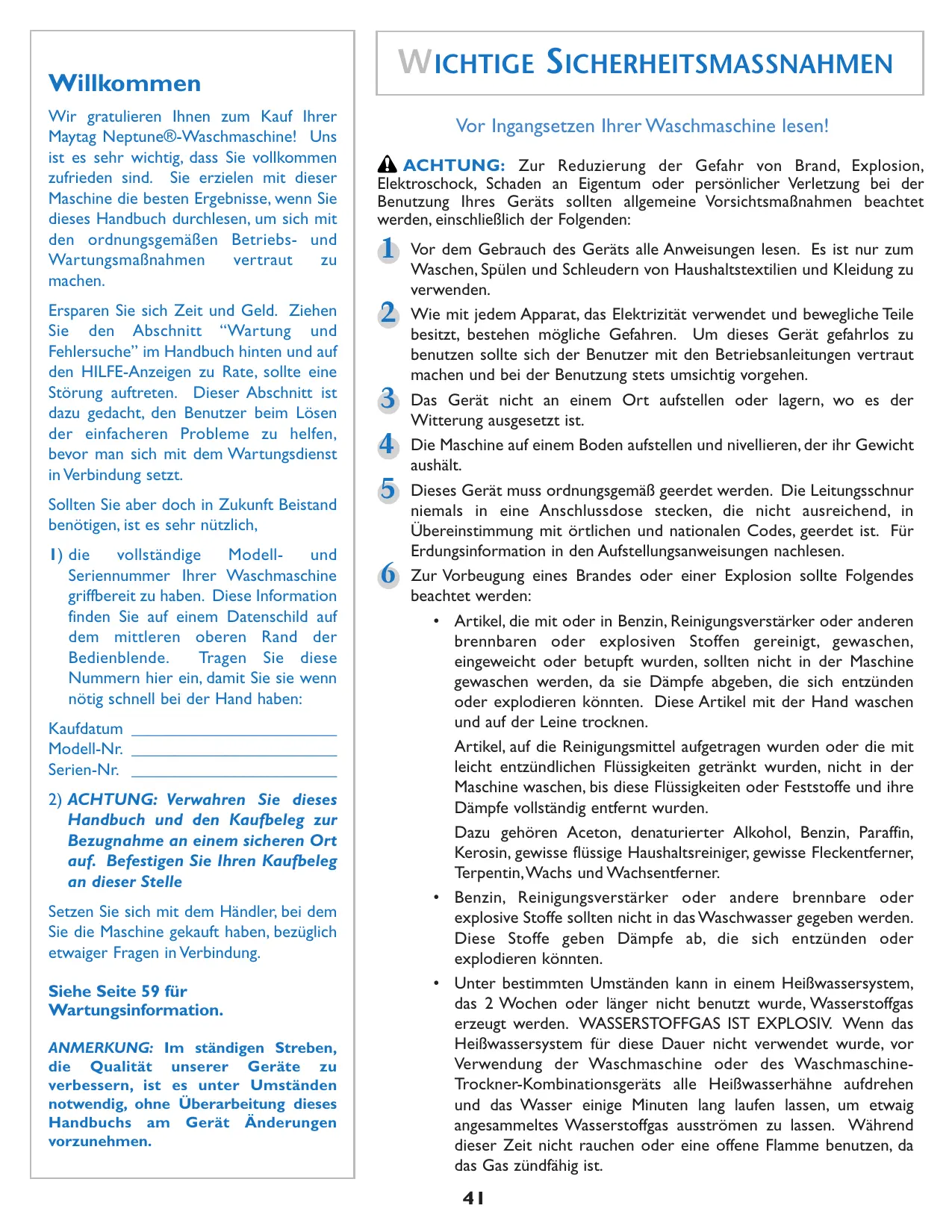 Willkommen Wir gratulieren Ihnen zum Kauf Ihrer Maytag Neptune®-Waschmaschine! Uns ist es sehr wichtig, dass Sie vollkommen zufrieden sind. Sie erzielen mit dieser Maschine die besten Ergebnisse, wenn Sie dieses Handbuch durchlesen, um sich mit den ordnungsgemäßen Betriebs- und Wartungsmaßnahmen vertraut machen. Ersparen Sie sich Zeit und Geld. Ziehen Sie den Abschnitt “Wartung und Fehlersuche” im Handbuch hinten und auf den HILFE-Anzeigen zu Rate, sollte eine Störung auftreten. Dieser Abschnitt ist dazu gedacht, den Benutzer beim Lösen der einfacheren Probleme zu helfen, bevor man sich mit dem Wartungsdienst in Verbindung setzt. Sollten Sie aber doch in Zukunft Beistand benötigen, ist es sehr nützlich,