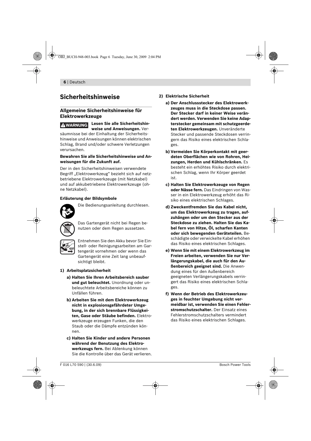 a) Der Anschlussstecker des Elektrowerkzeuges muss in die Steckdose passen. Der Stecker darf in keiner Weise verändert werden. Verwenden Sie keine Adapterstecker gemeinsam mit schutzgeerdeten Elektrowerkzeugen. Unveränderte Stecker und passende Steckdosen verringern das Risiko eines elektrischen Schlages. b) Vermeiden Sie Körperkontakt mit geerdeten Oberflächen wie von Rohren, Heizungen, Herden und Kühlschränken. Es besteht ein erhöhtes Risiko durch elektrischen Schlag, wenn Ihr Körper geerdet ist. c) Halten Sie Elektrowerkzeuge von Regen oder Nässe fern. Das Eindringen von Wasser in ein Elektrowerkzeug erhöht das Risiko eines elektrischen Schlages. d) Zweckentfremden Sie das Kabel nicht, um das Elektrowerkzeug zu tragen, aufzuhängen oder um den Stecker aus der Steckdose zu ziehen. Halten Sie das Kabel fern von Hitze, Öl, scharfen Kanten oder sich bewegenden Geräteteilen. Beschädigte oder verwickelte Kabel erhöhen das Risiko eines elektrischen Schlages. e) Wenn Sie mit einem Elektrowerkzeug im Freien arbeiten, verwenden Sie nur Verlängerungskabel, die auch für den Außenbereich geeignet sind. Die Anwendung eines für den Außenbereich geeigneten Verlängerungskabels verringert das Risiko eines elektrischen Schlages. f) Wenn der Betrieb des Elektrowerkzeuges in feuchter Umgebung nicht vermeidbar ist, verwenden Sie einen Fehlerstromschutzschalter. Der Einsatz eines Fehlerstromschutzschalters vermindert das Risiko eines elektrischen Schlages. c) Halten Sie Kinder und andere Personen während der Benutzung des Elektrowerkzeugs fern. Bei Ablenkung können Sie die Kontrolle über das Gerät verlieren. F 016 L70 590 | (30.6.09) Bosch Power Tools OBJ_BUCH-948-003.book Page 7 Tuesday, June 30, 2009 2:04 PM Deutsch | 7