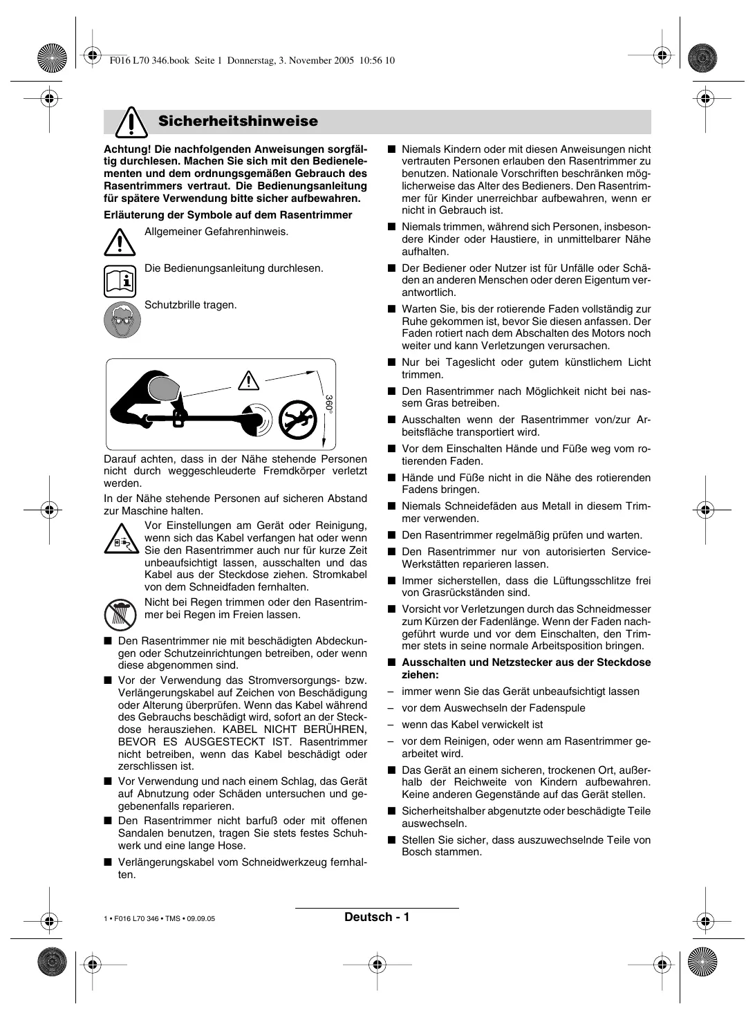 6 • F016 L70 346 • 05.11 CLICK! F016 L70 346.book Seite 7 Donnerstag, 3. November 2005 10:56 10 F 016 800 178 F 016 800 175 F 016 800 176 F 016 800 174 (ART 23/2300 COMBITRIM) 10x F 016 800 181 (ART 26/2600 COMBITRIM) F 016 800 182 (ART 30/3000 COMBITRIM) F 016 800 172 F 016 800 173 7 • F016 L70 346 • 05.11 F016 L70 346.book Seite 1 Donnerstag, 3. November 2005 10:56 10 Sicherheitshinweise Achtung! Die nachfolgenden Anweisungen sorgfältig durchlesen. Machen Sie sich mit den Bedienelementen und dem ordnungsgemäßen Gebrauch des Rasentrimmers vertraut. Die Bedienungsanleitung für spätere Verwendung bitte sicher aufbewahren. Erläuterung der Symbole auf dem Rasentrimmer Allgemeiner Gefahrenhinweis. ■ Niemals Kindern oder mit diesen Anweisungen nicht vertrauten Personen erlauben den Rasentrimmer zu benutzen. Nationale Vorschriften beschränken möglicherweise das Alter des Bedieners. Den Rasentrimmer für Kinder unerreichbar aufbewahren, wenn er nicht in Gebrauch ist. ■ Niemals trimmen, während sich Personen, insbesondere Kinder oder Haustiere, in unmittelbarer Nähe aufhalten. Die Bedienungsanleitung durchlesen. ■ Der Bediener oder Nutzer ist für Unfälle oder Schäden an anderen Menschen oder deren Eigentum verantwortlich. Schutzbrille tragen. ■ Warten Sie, bis der rotierende Faden vollständig zur Ruhe gekommen ist, bevor Sie diesen anfassen. Der Faden rotiert nach dem Abschalten des Motors noch weiter und kann Verletzungen verursachen. ■ Nur bei Tageslicht oder gutem künstlichem Licht trimmen. 360° ■ Den Rasentrimmer nach Möglichkeit nicht bei nassem Gras betreiben. ■ Ausschalten wenn der Rasentrimmer von/zur Arbeitsfläche transportiert wird. Darauf achten, dass in der Nähe stehende Personen nicht durch weggeschleuderte Fremdkörper verletzt werden. In der Nähe stehende Personen auf sicheren Abstand zur Maschine halten. Vor Einstellungen am Gerät oder Reinigung, wenn sich das Kabel verfangen hat oder wenn Sie den Rasentrimmer auch nur für kurze Zeit unbeaufsichtigt lassen, ausschalten und das Kabel aus der Steckdose ziehen. Stromkabel von dem Schneidfaden fernhalten. Nicht bei Regen trimmen oder den Rasentrimmer bei Regen im Freien lassen. ■ Den Rasentrimmer nie mit beschädigten Abdeckungen oder Schutzeinrichtungen betreiben, oder wenn diese abgenommen sind. ■ Vor der Verwendung das Stromversorgungs- bzw. Verlängerungskabel auf Zeichen von Beschädigung oder Alterung überprüfen. Wenn das Kabel während des Gebrauchs beschädigt wird, sofort an der Steckdose herausziehen. KABEL NICHT BERÜHREN, BEVOR ES AUSGESTECKT IST. Rasentrimmer nicht betreiben, wenn das Kabel beschädigt oder zerschlissen ist. ■ Vor Verwendung und nach einem Schlag, das Gerät auf Abnutzung oder Schäden untersuchen und gegebenenfalls reparieren. ■ Den Rasentrimmer nicht barfuß oder mit offenen Sandalen benutzen, tragen Sie stets festes Schuhwerk und eine lange Hose. ■ Verlängerungskabel vom Schneidwerkzeug fernhalten.