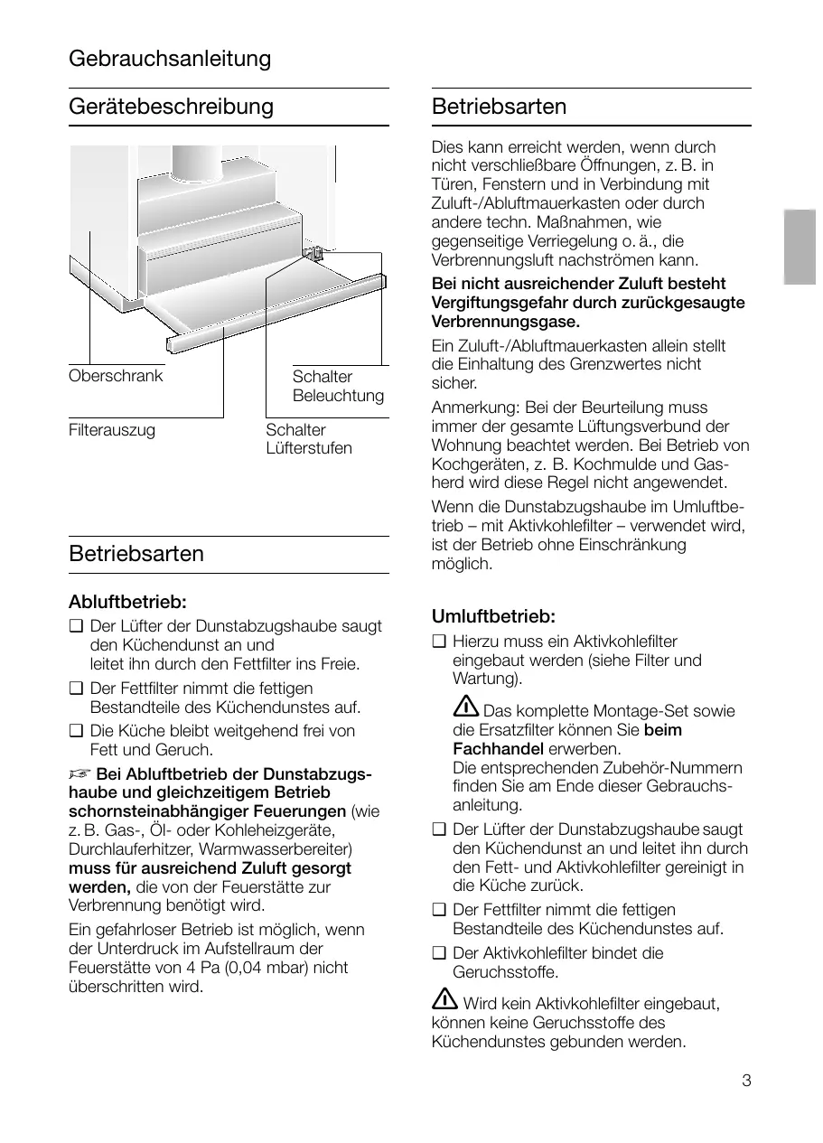min. 430 Gebrauchsanleitung Gerätebeschreibung Oberschrank Filterauszug Betriebsarten Schalter Beleuchtung Schalter Lüfterstufen Betriebsarten Abluftbetrieb: ❑ Der Lüfter der Dunstabzugshaube saugt den Küchendunst an und leitet ihn durch den Fettfilter ins Freie. ❑ Der Fettfilter nimmt die fettigen Bestandteile des Küchendunstes auf. ❑ Die Küche bleibt weitgehend frei von Fett und Geruch. D Bei Abluftbetrieb der Dunstabzugshaube und gleichzeitigem Betrieb schornsteinabhängiger Feuerungen (wie z. B. Gas-, Öl- oder Kohleheizgeräte, Durchlauferhitzer, Warmwasserbereiter) muss für ausreichend Zuluft gesorgt werden, die von der Feuerstätte zur Verbrennung benötigt wird. Ein gefahrloser Betrieb ist möglich, wenn der Unterdruck im Aufstellraum der Feuerstätte von 4 Pa (0,04 mbar) nicht überschritten wird. Dies kann erreicht werden, wenn durch nicht verschließbare Öffnungen, z. B. in Türen, Fenstern und in Verbindung mit Zuluft-/Abluftmauerkasten oder durch andere techn. Maßnahmen, wie gegenseitige Verriegelung o. ä., die Verbrennungsluft nachströmen kann. Bei nicht ausreichender Zuluft besteht Vergiftungsgefahr durch zurückgesaugte Verbrennungsgase. Ein Zuluft-/Abluftmauerkasten allein stellt die Einhaltung des Grenzwertes nicht sicher. Anmerkung: Bei der Beurteilung muss immer der gesamte Lüftungsverbund der Wohnung beachtet werden. Bei Betrieb von Kochgeräten, z. B. Kochmulde und Gasherd wird diese Regel nicht angewendet. Wenn die Dunstabzugshaube im Umluftbetrieb – mit Aktivkohlefilter – verwendet wird, ist der Betrieb ohne Einschränkung möglich. Umluftbetrieb: ❑ Hierzu muss ein Aktivkohlefilter eingebaut werden (siehe Filter und Wartung). Das komplette Montage-Set sowie die Ersatzfilter können Sie beim Fachhandel erwerben. Die entsprechenden Zubehör-Nummern finden Sie am Ende dieser Gebrauchsanleitung. ❑ Der Lüfter der Dunstabzugshaube saugt den Küchendunst an und leitet ihn durch den Fett- und Aktivkohlefilter gereinigt in die Küche zurück. ❑ Der Fettfilter nimmt die fettigen Bestandteile des Küchendunstes auf. ❑ Der Aktivkohlefilter bindet die Geruchsstoffe.