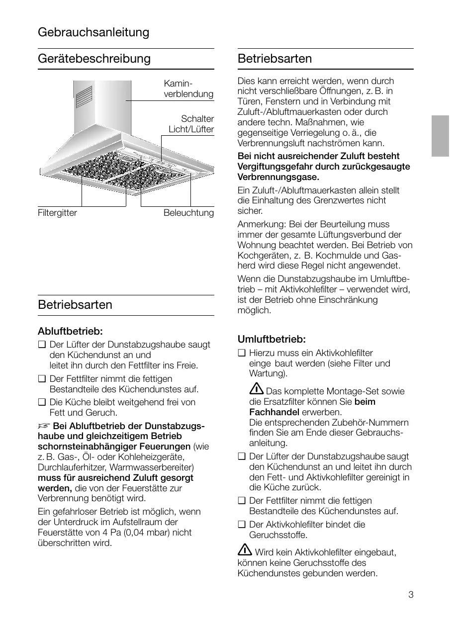 Gebrauchsanleitung Gerätebeschreibung Betriebsarten Kaminverblendung Schalter Licht/Lüfter Filtergitter Beleuchtung Betriebsarten Abluftbetrieb: ❑ Der Lüfter der Dunstabzugshaube saugt den Küchendunst an und leitet ihn durch den Fettfilter ins Freie. ❑ Der Fettfilter nimmt die fettigen Bestandteile des Küchendunstes auf. ❑ Die Küche bleibt weitgehend frei von Fett und Geruch. D Bei Abluftbetrieb der Dunstabzugshaube und gleichzeitigem Betrieb schornsteinabhängiger Feuerungen (wie z. B. Gas-, Öl- oder Kohleheizgeräte, Durchlauferhitzer, Warmwasserbereiter) muss für ausreichend Zuluft gesorgt werden, die von der Feuerstätte zur Verbrennung benötigt wird. Ein gefahrloser Betrieb ist möglich, wenn der Unterdruck im Aufstellraum der Feuerstätte von 4 Pa (0,04 mbar) nicht überschritten wird. Dies kann erreicht werden, wenn durch nicht verschließbare Öffnungen, z. B. in Türen, Fenstern und in Verbindung mit Zuluft-/Abluftmauerkasten oder durch andere techn. Maßnahmen, wie gegenseitige Verriegelung o. ä., die Verbrennungsluft nachströmen kann. Bei nicht ausreichender Zuluft besteht Vergiftungsgefahr durch zurückgesaugte Verbrennungsgase. Ein Zuluft-/Abluftmauerkasten allein stellt die Einhaltung des Grenzwertes nicht sicher. Anmerkung: Bei der Beurteilung muss immer der gesamte Lüftungsverbund der Wohnung beachtet werden. Bei Betrieb von Kochgeräten, z. B. Kochmulde und Gasherd wird diese Regel nicht angewendet. Wenn die Dunstabzugshaube im Umluftbetrieb – mit Aktivkohlefilter – verwendet wird, ist der Betrieb ohne Einschränkung möglich. Umluftbetrieb: ❑ Hierzu muss ein Aktivkohlefilter einge baut werden (siehe Filter und Wartung). Das komplette Montage-Set sowie die Ersatzfilter können Sie beim Fachhandel erwerben. Die entsprechenden Zubehör-Nummern finden Sie am Ende dieser Gebrauchsanleitung. ❑ Der Lüfter der Dunstabzugshaube saugt den Küchendunst an und leitet ihn durch den Fett- und Aktivkohlefilter gereinigt in die Küche zurück. ❑ Der Fettfilter nimmt die fettigen Bestandteile des Küchendunstes auf. ❑ Der Aktivkohlefilter bindet die Geruchsstoffe.