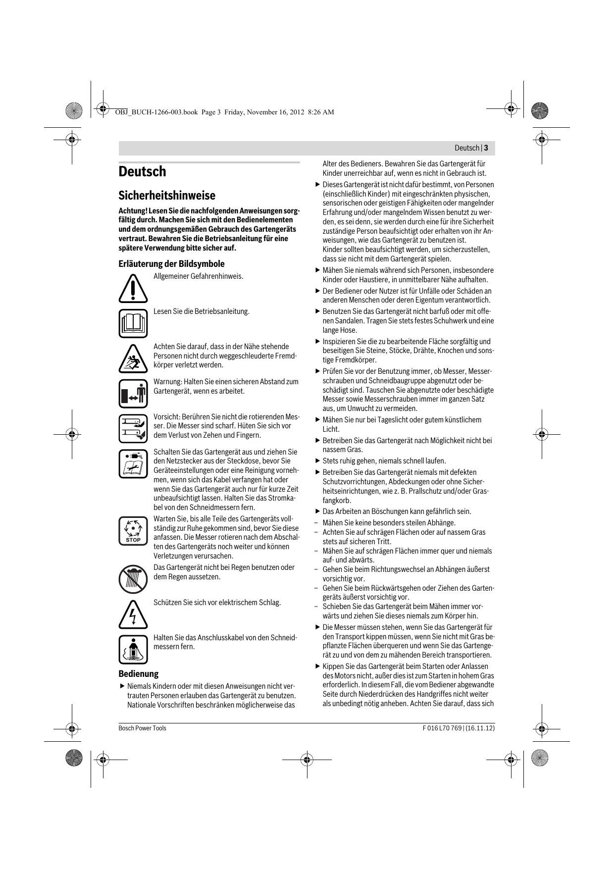 Eesti . . . . . . . . . . . . . . . . . . . . . . . . . . . . . . . . . . . . . . . . . Lehekülg 103 Latviešu . . . . . . . . . . . . . . . . . . . . . . . . . . . . . . . . . . . . . . Lappuse 107 Lietuviškai . . . . . . . . . . . . . . . . . . . . . . . . . . . . . . . . . . . . Puslapis 111 F 016 L70 769 | (16.11.12) Bosch Power Tools OBJ_BUCH-1266-003.book Page 3 Friday, November 16, 2012 8:26 AM Deutsch | 3 Deutsch Sicherheitshinweise Achtung! Lesen Sie die nachfolgenden Anweisungen sorgfältig durch. Machen Sie sich mit den Bedienelementen und dem ordnungsgemäßen Gebrauch des Gartengeräts vertraut. Bewahren Sie die Betriebsanleitung für eine spätere Verwendung bitte sicher auf. Erläuterung der Bildsymbole Allgemeiner Gefahrenhinweis. Lesen Sie die Betriebsanleitung. Achten Sie darauf, dass in der Nähe stehende Personen nicht durch weggeschleuderte Fremdkörper verletzt werden. Warnung: Halten Sie einen sicheren Abstand zum Gartengerät, wenn es arbeitet. Vorsicht: Berühren Sie nicht die rotierenden Messer. Die Messer sind scharf. Hüten Sie sich vor dem Verlust von Zehen und Fingern. Schalten Sie das Gartengerät aus und ziehen Sie den Netzstecker aus der Steckdose, bevor Sie Geräteeinstellungen oder eine Reinigung vornehmen, wenn sich das Kabel verfangen hat oder wenn Sie das Gartengerät auch nur für kurze Zeit unbeaufsichtigt lassen. Halten Sie das Stromkabel von den Schneidmessern fern. Warten Sie, bis alle Teile des Gartengeräts vollständig zur Ruhe gekommen sind, bevor Sie diese anfassen. Die Messer rotieren nach dem Abschalten des Gartengeräts noch weiter und können Verletzungen verursachen. Das Gartengerät nicht bei Regen benutzen oder dem Regen aussetzen. Schützen Sie sich vor elektrischem Schlag. Halten Sie das Anschlusskabel von den Schneidmessern fern. Bedienung Niemals Kindern oder mit diesen Anweisungen nicht vertrauten Personen erlauben das Gartengerät zu benutzen. Nationale Vorschriften beschränken möglicherweise das Bosch Power Tools Alter des Bedieners. Bewahren Sie das Gartengerät für Kinder unerreichbar auf, wenn es nicht in Gebrauch ist. Dieses Gartengerät ist nicht dafür bestimmt, von Personen (einschließlich Kinder) mit eingeschränkten physischen, sensorischen oder geistigen Fähigkeiten oder mangelnder Erfahrung und/oder mangelndem Wissen benutzt zu werden, es sei denn, sie werden durch eine für ihre Sicherheit zuständige Person beaufsichtigt oder erhalten von ihr Anweisungen, wie das Gartengerät zu benutzen ist. Kinder sollten beaufsichtigt werden, um sicherzustellen, dass sie nicht mit dem Gartengerät spielen. Mähen Sie niemals während sich Personen, insbesondere Kinder oder Haustiere, in unmittelbarer Nähe aufhalten. Der Bediener oder Nutzer ist für Unfälle oder Schäden an anderen Menschen oder deren Eigentum verantwortlich. Benutzen Sie das Gartengerät nicht barfuß oder mit offenen Sandalen. Tragen Sie stets festes Schuhwerk und eine lange Hose. Inspizieren Sie die zu bearbeitende Fläche sorgfältig und beseitigen Sie Steine, Stöcke, Drähte, Knochen und sonstige Fremdkörper. Prüfen Sie vor der Benutzung immer, ob Messer, Messerschrauben und Schneidbaugruppe abgenutzt oder beschädigt sind. Tauschen Sie abgenutzte oder beschädigte Messer sowie Messerschrauben immer im ganzen Satz aus, um Unwucht zu vermeiden. Mähen Sie nur bei Tageslicht oder gutem künstlichem Licht. Betreiben Sie das Gartengerät nach Möglichkeit nicht bei nassem Gras. Stets ruhig gehen, niemals schnell laufen. Betreiben Sie das Gartengerät niemals mit defekten Schutzvorrichtungen, Abdeckungen oder ohne Sicherheitseinrichtungen, wie z. B. Prallschutz und/oder Grasfangkorb. Das Arbeiten an Böschungen kann gefährlich sein. – Mähen Sie keine besonders steilen Abhänge. – Achten Sie auf schrägen Flächen oder auf nassem Gras stets auf sicheren Tritt. – Mähen Sie auf schrägen Flächen immer quer und niemals auf- und abwärts. – Gehen Sie beim Richtungswechsel an Abhängen äußerst vorsichtig vor. – Gehen Sie beim Rückwärtsgehen oder Ziehen des Gartengeräts äußerst vorsichtig vor. – Schieben Sie das Gartengerät beim Mähen immer vorwärts und ziehen Sie dieses niemals zum Körper hin. Die Messer müssen stehen, wenn Sie das Gartengerät für den Transport kippen müssen, wenn Sie nicht mit Gras bepflanzte Flächen überqueren und wenn Sie das Gartengerät zu und von dem zu mähenden Bereich transportieren. Kippen Sie das Gartengerät beim Starten oder Anlassen des Motors nicht, außer dies ist zum Starten in hohem Gras erforderlich. In diesem Fall, die vom Bediener abgewandte Seite durch Niederdrücken des Handgriffes nicht weiter als unbedingt nötig anheben. Achten Sie darauf, dass sich F 016 L70 769 | (16.11.12) OBJ_BUCH-1266-003.book Page 4 Friday, November 16, 2012 8:26 AM 4 | Deutsch Ihre Hände am Griff befinden, wenn Sie das Gartengerät wieder ablassen. Schalten Sie das Gartengerät wie in der Betriebsanleitung beschrieben ein und achten Sie darauf, dass Ihre Füße ausreichend weit von rotierenden Teilen entfernt sind. Bringen Sie Ihre Hände und Füße nicht in die Nähe oder unter rotierende Teile. Halten Sie Abstand zur Auswurfzone, wenn Sie mit dem Gartengerät arbeiten. Heben bzw. tragen Sie das Gartengerät niemals bei laufendem Motor. Halten Sie Strom- und Verlängerungskabel vom Messer fern. Das Messer kann die Kabel beschädigen und Sie mit spannungsführenden Teilen in Berührung bringen. Vorsicht, es besteht die Gefahr eines elektrischen Schlages. Netzstecker aus der Steckdose ziehen: – immer wenn Sie sich vom Gartengerät entfernen, – vor dem Beseitigen von Blockierungen, – wenn Sie das Gartengerät überprüfen, reinigen oder an ihm arbeiten, – nach der Kollision mit einem Fremdkörper. Überprüfen Sie das Gartengerät sofort auf Beschädigungen und lassen Sie es wenn notwendig instandsetzen, – wenn das Gartengerät ungewöhnlich zu vibrieren beginnt (sofort prüfen). Stromanschluss Die