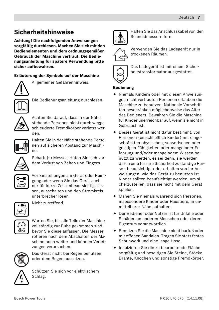 Achtung! Die nachfolgenden Anweisungen sorgfältig durchlesen. Machen Sie sich mit den Bedienelementen und dem ordnungsgemäßen Gebrauch der Maschine vertraut. Die Bedienungsanleitung für spätere Verwendung bitte sicher aufbewahren. Erläuterung der Symbole auf der Maschine Halten Sie das Anschlusskabel von den Schneidmessern fern. Verwenden Sie das Ladegerät nur in trockenen Räumen. Das Ladegerät ist mit einem Sicherheitstransformator ausgestattet. Allgemeiner Gefahrenhinweis. Bedienung Die Bedienungsanleitung durchlesen. Achten Sie darauf, dass in der Nähe stehende Personen nicht durch weggeschleuderte Fremdkörper verletzt werden. Halten Sie in der Nähe stehende Personen auf sicheren Abstand zur Maschine. Scharfe(s) Messer. Hüten Sie sich vor dem Verlust von Zehen und Fingern. Vor Einstellungen am Gerät oder Reinigung oder wenn Sie das Gerät auch nur für kurze Zeit unbeaufsichtigt lassen, ausschalten und den Stromkreisunterbrecher lösen. Nicht zutreffend. STOP Warten Sie, bis alle Teile der Maschine vollständig zur Ruhe gekommen sind, bevor Sie diese anfassen. Die Messer rotieren nach dem Abschalten der Maschine noch weiter und können Verletzungen verursachen. Das Gerät nicht bei Regen benutzen oder dem Regen aussetzen. f Niemals Kindern oder mit diesen Anweisungen nicht vertrauten Personen erlauben die Maschine zu benutzen. Nationale Vorschriften beschränken möglicherweise das Alter des Bedieners. Bewahren Sie die Maschine für Kinder unerreichbar auf, wenn sie nicht in Gebrauch ist. f Dieses Gerät ist nicht dafür bestimmt, von Personen (einschließlich Kinder) mit eingeschränkten physischen, sensorischen oder geistigen Fähigkeiten oder mangelnder Erfahrung und/oder mangelndem Wissen benutzt zu werden, es sei denn, sie werden durch eine für ihre Sicherheit zuständige Person beaufsichtigt oder erhalten von ihr Anweisungen, wie das Gerät zu benutzen ist. Kinder sollten beaufsichtigt werden, um sicherzustellen, dass sie nicht mit dem Gerät spielen. f Mähen Sie niemals während sich Personen, insbesondere Kinder oder Haustiere, in unmittelbarer Nähe aufhalten. f Der Bediener oder Nutzer ist für Unfälle oder Schäden an anderen Menschen oder deren Eigentum verantwortlich. f Benutzen Sie die Maschine nicht barfuß oder mit offenen Sandalen. Tragen Sie stets festes Schuhwerk und eine lange Hose. f Inspizieren Sie die zu bearbeitende Fläche sorgfältig und beseitigen Sie Steine, Stöcke, Drähte, Knochen und sonstige Fremdkörper. Schützen Sie sich vor elektrischem Schlag. Bosch Power Tools F 016 L70 576 | (14.11.08) 8 | Deutsch f Prüfen Sie vor der Benutzung immer, ob Messer, Messerschrauben und Schneidbaugruppe abgenutzt oder beschädigt sind. Tauschen Sie abgenutzte oder beschädigte Messer sowie Messerschrauben immer im ganzen Satz aus, um Unwucht zu vermeiden. f Schalten Sie die Maschine wie in der Betriebsanleitung beschrieben ein und achten Sie darauf, dass Ihre Füße ausreichend weit von rotierenden Teilen entfernt sind. f Mähen Sie nur bei Tageslicht oder gutem künstlichem Licht. f Halten Sie Abstand zur Auswurfzone, wenn Sie mit der Maschine arbeiten. f Betreiben Sie die Maschine nach Möglichkeit nicht bei nassem Gras. f Heben bzw. tragen Sie die Maschine niemals bei laufendem Motor. f Stets ruhig gehen, niemals schnell laufen. f Betreiben Sie die Maschine niemals mit defekten Schutzvorrichtungen, Abdeckungen oder ohne Sicherheitseinrichtungen, wie z. B. Prallschutz und/oder Grasfangkorb. f Das Arbeiten an Böschungen kann gefährlich sein. – Mähen Sie keine besonders steilen Abhänge. – Achten Sie auf schrägen Flächen oder auf nassem Gras stets auf sicheren Tritt. – Mähen Sie auf schrägen Flächen immer quer und niemals auf- und abwärts. – Gehen Sie beim Richtungswechsel an Abhängen äußerst vorsichtig vor. f Gehen Sie beim Rückwärtsgehen oder Ziehen der Maschine äußerst vorsichtig vor. f Schieben Sie die Maschine beim Mähen immer vorwärts und ziehen Sie diese niemals zum Körper hin. f Die Messer müssen stehen, wenn Sie die Maschine für den Transport kippen müssen, wenn Sie nicht mit Gras bepflanzte Flächen überqueren und wenn Sie die Maschine zu und von dem zu mähenden Bereich transportieren. f Kippen Sie die Maschine beim Starten oder Anlassen des Motors nicht, außer dies ist zum Starten in hohem Gras erforderlich. In diesem Fall, die vom Bediener abgewandte Seite durch Niederdrücken des Handgriffes nicht weiter als unbedingt nötig anheben. Achten Sie darauf, dass sich Ihre Hände am Griff befinden, wenn Sie die Maschine wieder ablassen. F 016 L70 576 | (14.11.08) f Bringen Sie Ihre Hände und Füße nicht in die Nähe oder unter rotierende Teile. Stromkreisunterbrecher lösen: – immer wenn Sie sich von der Maschine entfernen, – vor dem Beseitigen von Blockierungen, – wenn Sie die Maschine überprüfen, reinigen oder an ihr arbeiten, – nach der Kollision mit einem Fremdkörper. Überprüfen Sie die Maschine sofort auf Beschädigungen und lassen Sie diese wenn notwendig instandsetzen, – wenn die Maschine ungewöhnlich zu vibrieren beginnt (sofort prüfen). Wartung f Stellen Sie den Festsitz aller Muttern, Bolzen und Schrauben sicher, damit ein sicherer Arbeitszustand der Maschine gewährleistet ist. f Überprüfen Sie regelmäßig den Grasfangkorb auf Zustand und Abnutzung. f Überprüfen Sie die Maschine und ersetzen Sie sicherheitshalber abgenutzte oder beschädigte Teile. f Verwenden Sie ausschließlich für die Maschine vorgesehene Schneidmesser. f Stellen Sie sicher, dass auszuwechselnde Teile von Bosch stammen. f Tragen Sie immer Gartenhandschuhe, wenn Sie im Bereich der scharfen Messer hantieren oder arbeiten. Hinweise für den optimalen Umgang mit dem Akku f Stellen Sie sicher, dass das Gerät ausgeschaltet ist, bevor Sie den Akku einsetzen. Das Einsetzen eines Akkus in ein Gerät, das eingeschaltet ist, kann zu Unfällen führen. Bosch Power Tools Deutsch | 9 f Halten Sie das Ladegerät von Re