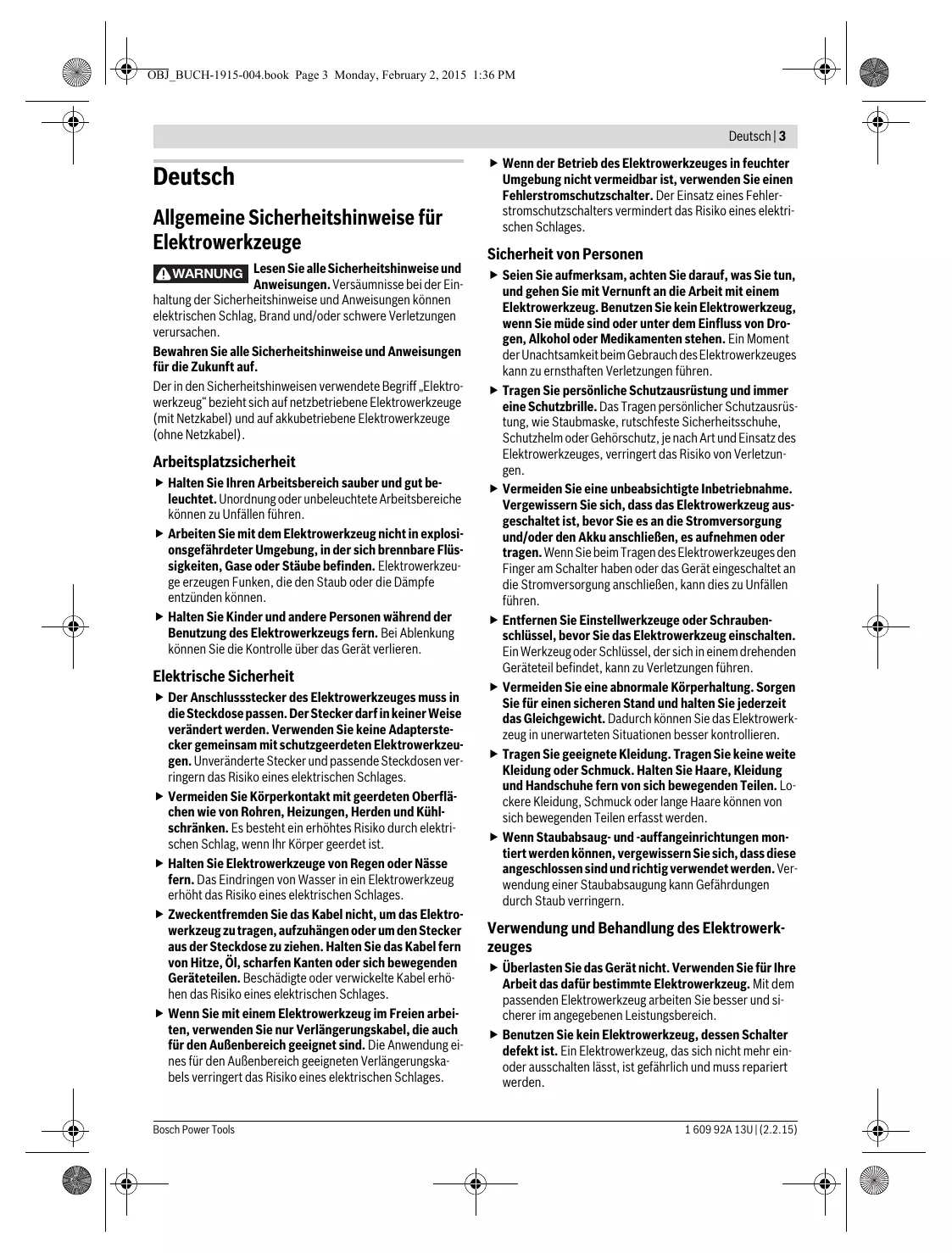 Bosch Power Tools OBJ_BUCH-1915-004.book Page 3 Monday, February 2, 2015 1:36 PM Deutsch | 3 Deutsch Allgemeine Sicherheitshinweise für Elektrowerkzeuge WARNUNG Lesen Sie alle Sicherheitshinweise und Anweisungen. Versäumnisse bei der Einhaltung der Sicherheitshinweise und Anweisungen können elektrischen Schlag, Brand und/oder schwere Verletzungen verursachen. Bewahren Sie alle Sicherheitshinweise und Anweisungen für die Zukunft auf. Der in den Sicherheitshinweisen verwendete Begriff „Elektrowerkzeug“ bezieht sich auf netzbetriebene Elektrowerkzeuge (mit Netzkabel) und auf akkubetriebene Elektrowerkzeuge (ohne Netzkabel). Arbeitsplatzsicherheit Halten Sie Ihren Arbeitsbereich sauber und gut beleuchtet. Unordnung oder unbeleuchtete Arbeitsbereiche können zu Unfällen führen. Arbeiten Sie mit dem Elektrowerkzeug nicht in explosionsgefährdeter Umgebung, in der sich brennbare Flüssigkeiten, Gase oder Stäube befinden. Elektrowerkzeuge erzeugen Funken, die den Staub oder die Dämpfe entzünden können. Halten Sie Kinder und andere Personen während der Benutzung des Elektrowerkzeugs fern. Bei Ablenkung können Sie die Kontrolle über das Gerät verlieren. Elektrische Sicherheit Der Anschlussstecker des Elektrowerkzeuges muss in die Steckdose passen. Der Stecker darf in keiner Weise verändert werden. Verwenden Sie keine Adapterstecker gemeinsam mit schutzgeerdeten Elektrowerkzeugen. Unveränderte Stecker und passende Steckdosen verringern das Risiko eines elektrischen Schlages. Vermeiden Sie Körperkontakt mit geerdeten Oberflächen wie von Rohren, Heizungen, Herden und Kühlschränken. Es besteht ein erhöhtes Risiko durch elektrischen Schlag, wenn Ihr Körper geerdet ist. Halten Sie Elektrowerkzeuge von Regen oder Nässe fern. Das Eindringen von Wasser in ein Elektrowerkzeug erhöht das Risiko eines elektrischen Schlages. Zweckentfremden Sie das Kabel nicht, um das Elektrowerkzeug zu tragen, aufzuhängen oder um den Stecker aus der Steckdose zu ziehen. Halten Sie das Kabel fern von Hitze, Öl, scharfen Kanten oder sich bewegenden Geräteteilen. Beschädigte oder verwickelte Kabel erhöhen das Risiko eines elektrischen Schlages. Wenn Sie mit einem Elektrowerkzeug im Freien arbeiten, verwenden Sie nur Verlängerungskabel, die auch für den Außenbereich geeignet sind. Die Anwendung eines für den Außenbereich geeigneten Verlängerungskabels verringert das Risiko eines elektrischen Schlages. Bosch Power Tools Wenn der Betrieb des Elektrowerkzeuges in feuchter Umgebung nicht vermeidbar ist, verwenden Sie einen Fehlerstromschutzschalter. Der Einsatz eines Fehlerstromschutzschalters vermindert das Risiko eines elektrischen Schlages. Sicherheit von Personen Seien Sie aufmerksam, achten Sie darauf, was Sie tun, und gehen Sie mit Vernunft an die Arbeit mit einem Elektrowerkzeug. Benutzen Sie kein Elektrowerkzeug, wenn Sie müde sind oder unter dem Einfluss von Drogen, Alkohol oder Medikamenten stehen. Ein Moment der Unachtsamkeit beim Gebrauch des Elektrowerkzeuges kann zu ernsthaften Verletzungen führen. Tragen Sie persönliche Schutzausrüstung und immer eine Schutzbrille. Das Tragen persönlicher Schutzausrüstung, wie Staubmaske, rutschfeste Sicherheitsschuhe, Schutzhelm oder Gehörschutz, je nach Art und Einsatz des Elektrowerkzeuges, verringert das Risiko von Verletzungen. Vermeiden Sie eine unbeabsichtigte Inbetriebnahme. Vergewissern Sie sich, dass das Elektrowerkzeug ausgeschaltet ist, bevor Sie es an die Stromversorgung und/oder den Akku anschließen, es aufnehmen oder tragen. Wenn Sie beim Tragen des Elektrowerkzeuges den Finger am Schalter haben oder das Gerät eingeschaltet an die Stromversorgung anschließen, kann dies zu Unfällen führen. Entfernen Sie Einstellwerkzeuge oder Schraubenschlüssel, bevor Sie das Elektrowerkzeug einschalten. Ein Werkzeug oder Schlüssel, der sich in einem drehenden Geräteteil befindet, kann zu Verletzungen führen. Vermeiden Sie eine abnormale Körperhaltung. Sorgen Sie für einen sicheren Stand und halten Sie jederzeit das Gleichgewicht. Dadurch können Sie das Elektrowerkzeug in unerwarteten Situationen besser kontrollieren. Tragen Sie geeignete Kleidung. Tragen Sie keine weite Kleidung oder Schmuck. Halten Sie Haare, Kleidung und Handschuhe fern von sich bewegenden Teilen. Lockere Kleidung, Schmuck oder lange Haare können von sich bewegenden Teilen erfasst werden. Wenn Staubabsaug- und -auffangeinrichtungen montiert werden können, vergewissern Sie sich, dass diese angeschlossen sind und richtig verwendet werden. Verwendung einer Staubabsaugung kann Gefährdungen durch Staub verringern. Verwendung und Behandlung des Elektrowerkzeuges Überlasten Sie das Gerät nicht. Verwenden Sie für Ihre Arbeit das dafür bestimmte Elektrowerkzeug. Mit dem passenden Elektrowerkzeug arbeiten Sie besser und sicherer im angegebenen Leistungsbereich. Benutzen Sie kein Elektrowerkzeug, dessen Schalter defekt ist. Ein Elektrowerkzeug, das sich nicht mehr einoder ausschalten lässt, ist gefährlich und muss repariert werden. 1 609 92A 13U | (2.2.15) OBJ_BUCH-1915-004.book Page 4 Monday, February 2, 2015 1:36 PM 4 | Deutsch Ziehen Sie den Stecker aus der Steckdose und/oder entfernen Sie den Akku, bevor Sie Geräteeinstellungen vornehmen, Zubehörteile wechseln oder das Gerät weglegen. Diese Vorsichtsmaßnahme verhindert den unbeabsichtigten Start des Elektrowerkzeuges. Bewahren Sie unbenutzte Elektrowerkzeuge außerhalb der Reichweite von Kindern auf. Lassen Sie Personen das Gerät nicht benutzen, die mit diesem nicht vertraut sind oder diese Anweisungen nicht gelesen haben. Elektrowerkzeuge sind gefährlich, wenn sie von unerfahrenen Personen benutzt werden. Pflegen Sie Elektrowerkzeuge mit Sorgfalt. Kontrollieren Sie, ob bewegliche Teile einwandfrei funktionieren und nicht klemmen, ob Teile gebrochen oder so beschädigt sind, dass die Funktion des Elektrowerkzeuges beeinträchtigt ist. Lassen Sie beschädigte Teile vor dem Einsatz des Gerätes reparieren.