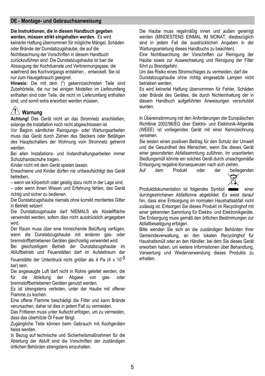 DE - Montage- und Gebrauchsanweisung Die Instruktionen, die in diesem Handbuch gegeben werden, müssen strikt eingehalten werden. Es wird keinerlei Haftung übernommen für mögliche Mängel, Schäden oder Brände der Dunstabzugshaube, die auf die Nichtbeachtung der Vorschriften in diesem Handbuch zurückzuführen sind. Die Dunstabzugshaube ist fuer die Absaugung der Kochduenste und Verbrennungsgase, die waehrend des Kochvorgangs entstehen , entwickelt. Sie ist nur zum Hausgebrauch geeignet. Hinweis: Die mit dem (*) gekennzeichneten Teile sind Zubehörteile, die nur bei einigen Modellen im Lieferumfang enthalten sind oder Teile, die nicht im Lieferumfang enthalten sind, und somit extra erworben werden müssen. Die Haube muss regelmäßig innen und außen gereinigt werden (MINDESTENS EINMAL IM MONAT, diesbezüglich sind in jedem Fall die ausdrücklichen Angaben in der Wartungsanleitung dieses Handbuchs zu beachten). Eine Nichtbeachtung der Vorschriften zur Reinigung der Haube sowie zur Auswechselung und Reinigung der Filter führt zu Brandgefahr. Um das Risiko eines Stromschlages zu vermeiden, darf die Dunstabzugshaube ohne richtig eingesetzte Lampen nicht betrieben werden. Es wird keinerlei Haftung übernommen für Fehler, Schäden oder Brände des Gerätes, die durch Nichteinhaltung der in diesem Handbuch aufgeführten Anweisungen verschuldet wurden. Warnung In Übereinstimmung mit den Anforderungen der Europäischen Richtlinie 2002/96/EG über Elektro- und Elektronik-Altgeräte (WEEE) ist vorliegendes Gerät mit einer Kennzeichnung versehen. Sie leisten einen positiven Beitrag für den Schutz der Umwelt und die Gesundheit des Menschen, wenn Sie dieses Gerät einer gesonderten Abfallsammlung zuführen. Im unsortierten Siedlungsmüll könnte ein solches Gerät durch unsachgemäße Entsorgung negative Konsequenzen nach sich ziehen. Auf dem Produkt oder der beiliegenden Achtung! Das Gerät nicht an das Stromnetz anschließen, solange die Installation noch nicht abgeschlossen ist. Vor Beginn sämtlicher Reinigungs- oder Wartungsarbeiten muss das Gerät durch Ziehen des Steckers oder Betätigen des Hauptschalters der Wohnung vom Stromnetz getrennt werden. Bei allen Installations- und Instandhaltungsarbeiten immer Schutzhandschuhe tragen. Kinder nicht mit dem Gerät spielen lassen. Erwachsene und Kinder dürfen nie unbeaufsichtigt das Gerät betreiben, – wenn sie körperlich oder geistig dazu nicht in der Lage sind, – oder wenn ihnen Wissen und Erfahrung fehlen, das Gerät richtig und sicher zu bedienen. Die Dunstabzugshaube niemals ohne korrekt montiertes Gitter in Betrieb setzen! Die Dunstabzugshaube darf NIEMALS als Abstellfläche verwendet werden, sofern dies nicht ausdrücklich angegeben wird. Der Raum muss über eine hinreichende Belüftung verfügen, wenn die Dunstabzugshaube mit anderen gas- oder brennstoffbetriebenen Geräten gleichzeitig verwendet wird. Bei gleichzeitigem Betrieb der Dunstabzugshaube im Abluftbetrieb und Feuerstätten darf im Aufstellraum der Feuerstätte der Unterdruck nicht größer als 4 Pa (4 x 10-5 einer Produktdokumentation ist folgendes Symbol durchgestrichenen Abfalltonne abgebildet. Es weist darauf hin, dass eine Entsorgung im normalen Haushaltsabfall nicht zulässig ist. Entsorgen Sie dieses Produkt im Recyclinghof mit einer getrennten Sammlung für Elektro- und Elektronikgeräte. Die Entsorgung muss gemäß den örtlichen Bestimmungen zur Abfallbeseitigung erfolgen. Bitte wenden Sie sich an die zuständigen Behörden Ihrer Gemeindeverwaltung, an den lokalen Recyclinghof für Haushaltsmüll oder an den Händler, bei dem Sie dieses Gerät erworben haben, um weitere Informationen über Behandlung, Verwertung und Wiederverwendung dieses Produkts zu erhalten. bar) sein. Die angesaugte Luft darf nicht in Rohre geleitet werden, die für die Ableitung der Abgase von gas- oder brennstoffbetriebenen Geräten genutzt werden. Es ist strengstens verboten, unter der Haube mit offener Flamme zu kochen. Eine offene Flamme beschädigt die Filter und kann Brände verursachen, daher ist dies in jedem Fall zu vermeiden. Das Frittieren muss unter Aufsicht erfolgen, um zu vermeiden, dass das überhitzte Öl Feuer fängt. Zugängliche Teile können beim Gebrauch mit Kochgeräten heiss werden. In Bezug auf technische und Sicherheitsmaßnahmen für die Ableitung der Abluft sind die Vorschriften der zuständigen örtlichen Behörden strengstens einzuhalten.