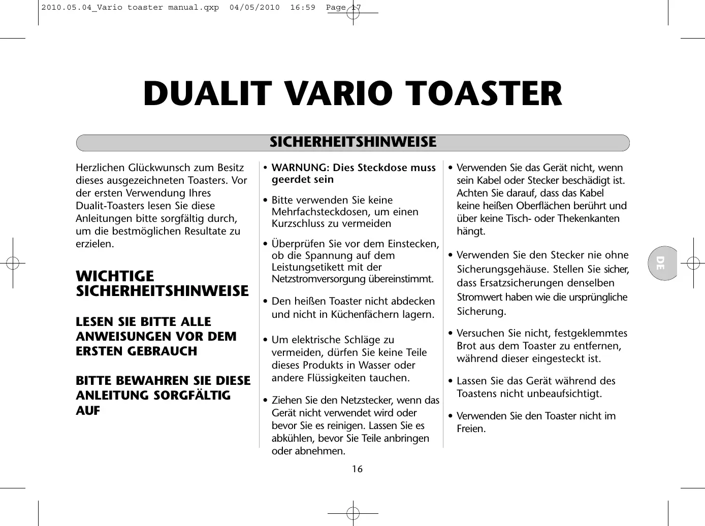 - WARNUNG: Dies Steckdose muss geerdet sein 2010.05.04_Vario toaster manual.qxp 04/05/2010 16:59 Page 18 SICHERHEITSHINWEISE