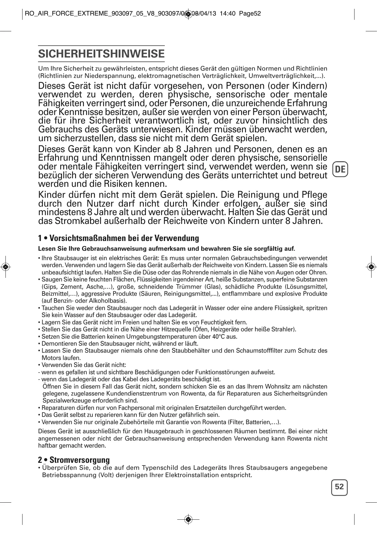RO_AIR_FORCE_EXTREME_903097_05_V8_903097/05 08/04/13 14:40 Page52 SICHERHEITSHINWEISE Um Ihre Sicherheit zu gewährleisten, entspricht dieses Gerät den gültigen Normen und Richtlinien (Richtlinien zur Niederspannung, elektromagnetischen Verträglichkeit, Umweltverträglichkeit,...). Dieses Gerät ist nicht dafür vorgesehen, von Personen (oder Kindern) verwendet zu werden, deren physische, sensorische oder mentale Fähigkeiten verringert sind, oder Personen, die unzureichende Erfahrung oder Kenntnisse besitzen, außer sie werden von einer Person überwacht, die für ihre Sicherheit verantwortlich ist, oder zuvor hinsichtlich des Gebrauchs des Geräts unterwiesen. Kinder müssen überwacht werden, um sicherzustellen, dass sie nicht mit dem Gerät spielen. Dieses Gerät kann von Kinder ab 8 Jahren und Personen, denen es an Erfahrung und Kenntnissen mangelt oder deren physische, sensorielle oder mentale Fähigkeiten verringert sind, verwendet werden, wenn sie DE bezüglich der sicheren Verwendung des Geräts unterrichtet und betreut werden und die Risiken kennen. Kinder dürfen nicht mit dem Gerät spielen. Die Reinigung und Pflege durch den Nutzer darf nicht durch Kinder erfolgen, außer sie sind mindestens 8 Jahre alt und werden überwacht. Halten Sie das Gerät und das Stromkabel außerhalb der Reichweite von Kindern unter 8 Jahren. 1 • Vorsichtsmaßnahmen bei der Verwendung Lesen Sie Ihre Gebrauchsanweisung aufmerksam und bewahren Sie sie sorgfältig auf.
