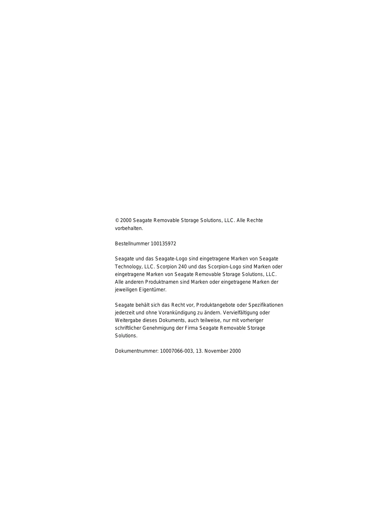 Seagate se reserva el derecho de modificar sin previo aviso las ofertas o las características técnicas relativas a los productos. Se prohibe la reproducción total o parcial de esta publicación en cualquier forma sin el permiso por escrito de Seagate Removable Storage Solutions. Número de publicación: 10007066-003, 13 de noviembre de 2000