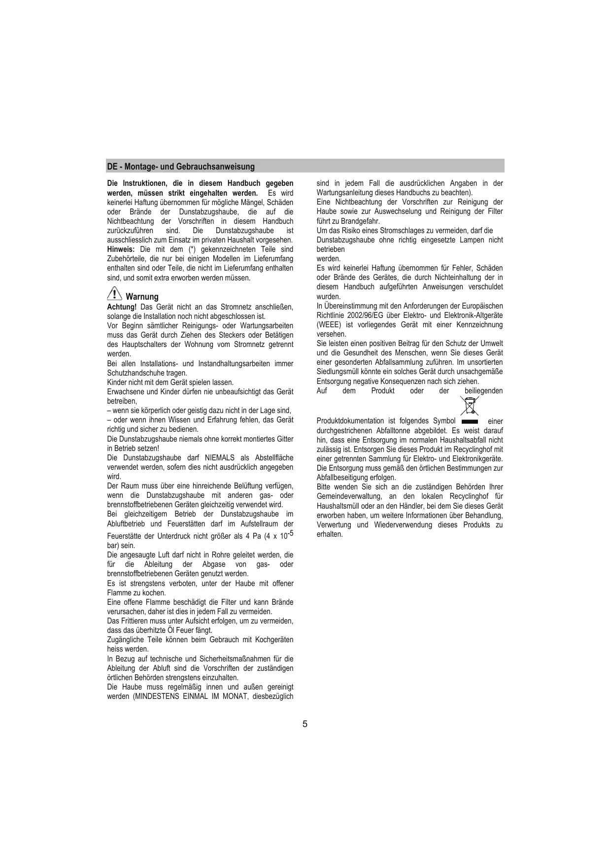 Monterings- och bruksanvisningar Instrukser for montering og bruk Bruger- og monteringsvejledning DE - Montage- und Gebrauchsanweisung sind in jedem Fall die ausdrücklichen Angaben in der Wartungsanleitung dieses Handbuchs zu beachten). Eine Nichtbeachtung der Vorschriften zur Reinigung der Haube sowie zur Auswechselung und Reinigung der Filter führt zu Brandgefahr. Um das Risiko eines Stromschlages zu vermeiden, darf die Dunstabzugshaube ohne richtig eingesetzte Lampen nicht betrieben werden. Es wird keinerlei Haftung übernommen für Fehler, Schäden oder Brände des Gerätes, die durch Nichteinhaltung der in diesem Handbuch aufgeführten Anweisungen verschuldet wurden. In Übereinstimmung mit den Anforderungen der Europäischen Richtlinie 2002/96/EG über Elektro- und Elektronik-Altgeräte (WEEE) ist vorliegendes Gerät mit einer Kennzeichnung versehen. Sie leisten einen positiven Beitrag für den Schutz der Umwelt und die Gesundheit des Menschen, wenn Sie dieses Gerät einer gesonderten Abfallsammlung zuführen. Im unsortierten Siedlungsmüll könnte ein solches Gerät durch unsachgemäße Entsorgung negative Konsequenzen nach sich ziehen. Auf dem Produkt oder der beiliegenden Die Instruktionen, die in diesem Handbuch gegeben werden, müssen strikt eingehalten werden. Es wird keinerlei Haftung übernommen für mögliche Mängel, Schäden oder Brände der Dunstabzugshaube, die auf die Nichtbeachtung der Vorschriften in diesem Handbuch zurückzuführen sind. Die Dunstabzugshaube ist ausschliesslich zum Einsatz im privaten Haushalt vorgesehen. Hinweis: Die mit dem (*) gekennzeichneten Teile sind Zubehörteile, die nur bei einigen Modellen im Lieferumfang enthalten sind oder Teile, die nicht im Lieferumfang enthalten sind, und somit extra erworben werden müssen. Warnung Achtung! Das Gerät nicht an das Stromnetz anschließen, solange die Installation noch nicht abgeschlossen ist. Vor Beginn sämtlicher Reinigungs- oder Wartungsarbeiten muss das Gerät durch Ziehen des Steckers oder Betätigen des Hauptschalters der Wohnung vom Stromnetz getrennt werden. Bei allen Installations- und Instandhaltungsarbeiten immer Schutzhandschuhe tragen. Kinder nicht mit dem Gerät spielen lassen. Erwachsene und Kinder dürfen nie unbeaufsichtigt das Gerät betreiben, – wenn sie körperlich oder geistig dazu nicht in der Lage sind, – oder wenn ihnen Wissen und Erfahrung fehlen, das Gerät richtig und sicher zu bedienen. Die Dunstabzugshaube niemals ohne korrekt montiertes Gitter in Betrieb setzen! Die Dunstabzugshaube darf NIEMALS als Abstellfläche verwendet werden, sofern dies nicht ausdrücklich angegeben wird. Der Raum muss über eine hinreichende Belüftung verfügen, wenn die Dunstabzugshaube mit anderen gas- oder brennstoffbetriebenen Geräten gleichzeitig verwendet wird. Bei gleichzeitigem Betrieb der Dunstabzugshaube im Abluftbetrieb und Feuerstätten darf im Aufstellraum der Feuerstätte der Unterdruck nicht größer als 4 Pa (4 x 10-5 Produktdokumentation ist folgendes Symbol einer durchgestrichenen Abfalltonne abgebildet. Es weist darauf hin, dass eine Entsorgung im normalen Haushaltsabfall nicht zulässig ist. Entsorgen Sie dieses Produkt im Recyclinghof mit einer getrennten Sammlung für Elektro- und Elektronikgeräte. Die Entsorgung muss gemäß den örtlichen Bestimmungen zur Abfallbeseitigung erfolgen. Bitte wenden Sie sich an die zuständigen Behörden Ihrer Gemeindeverwaltung, an den lokalen Recyclinghof für Haushaltsmüll oder an den Händler, bei dem Sie dieses Gerät erworben haben, um weitere Informationen über Behandlung, Verwertung und Wiederverwendung dieses Produkts zu erhalten. bar) sein. Die angesaugte Luft darf nicht in Rohre geleitet werden, die für die Ableitung der Abgase von gas- oder brennstoffbetriebenen Geräten genutzt werden. Es ist strengstens verboten, unter der Haube mit offener Flamme zu kochen. Eine offene Flamme beschädigt die Filter und kann Brände verursachen, daher ist dies in jedem Fall zu vermeiden. Das Frittieren muss unter Aufsicht erfolgen, um zu vermeiden, dass das überhitzte Öl Feuer fängt. Zugängliche Teile können beim Gebrauch mit Kochgeräten heiss werden. In Bezug auf technische und Sicherheitsmaßnahmen für die Ableitung der Abluft sind die Vorschriften der zuständigen örtlichen Behörden strengstens einzuhalten. Die Haube muss regelmäßig innen und außen gereinigt werden (MINDESTENS EINMAL IM MONAT, diesbezüglich