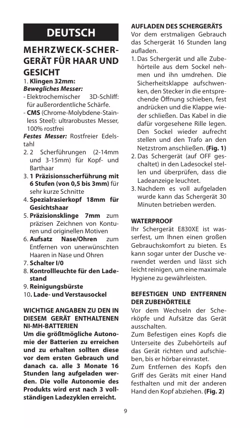 WATERPROOF Ihr Schergerät E830XE ist wasserfest, um Ihnen einen großen Gebrauchskomfort zu bieten. Es kann sogar unter der Dusche verwendet werden und lässt sich leicht reinigen, um eine maximale Hygiene zu gewährleisten. BEFESTIGEN UND ENTFERNEN DER ZUBEHÖRTEILE Vor dem Wechseln der Scherköpfe und Aufsätze das Gerät ausschalten. Zum Befestigen eines Kopfs die Unterseite des Zubehörteils auf das Gerät richten und aufschieben, bis er hörbar einrastet. Zum Entfernen des Kopfs den Griff des Geräts mit einer Hand festhalten und mit der anderen Hand den Kopf abziehen. (Fig. 2)