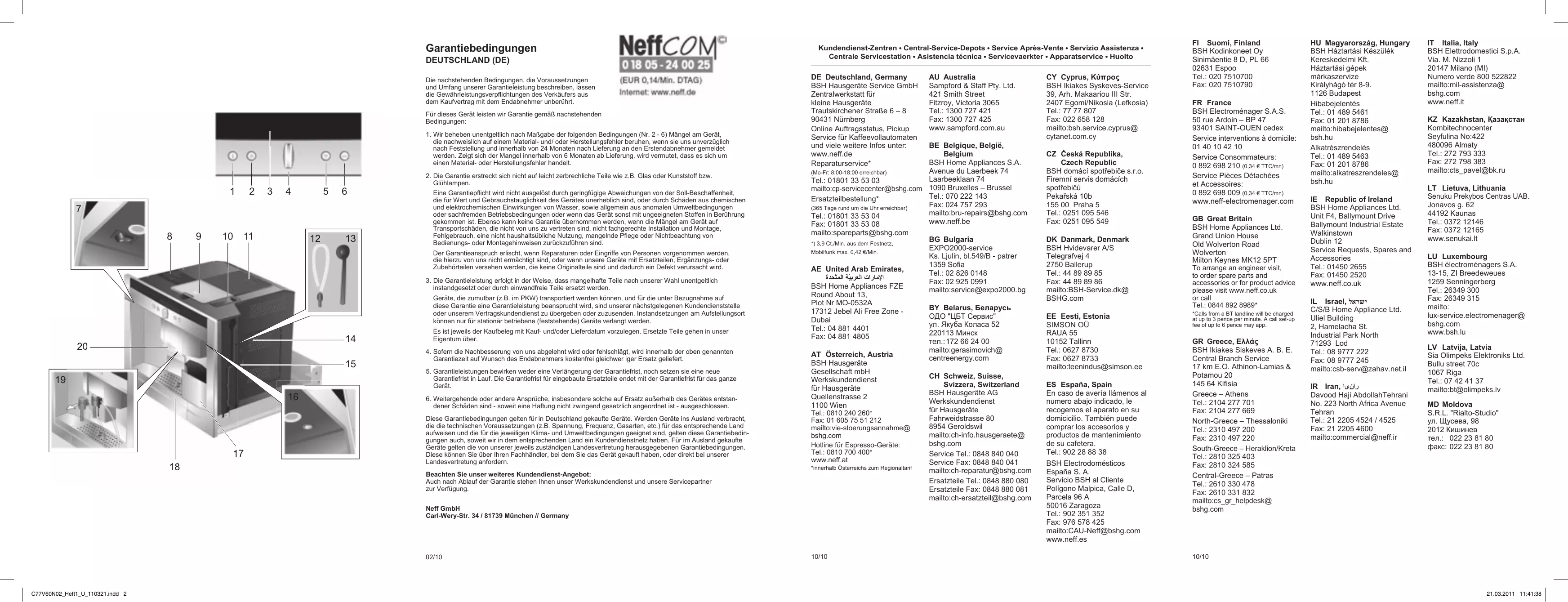 Garantiefrist in Lauf. Die Garantiefrist für eingebaute Ersatzteile endet mit der Garantiefrist für das ganze Gerät. 6. Weitergehende oder andere Ansprüche, insbesondere solche auf Ersatz außerhalb des Gerätes entstandener Schäden sind - soweit eine Haftung nicht zwingend gesetzlich angeordnet ist - ausgeschlossen. Diese Garantiebedingungen gelten für in Deutschland gekaufte Geräte. Werden Geräte ins Ausland verbracht, die die technischen Voraussetzungen (z.B. Spannung, Frequenz, Gasarten, etc.) für das entsprechende Land aufweisen und die für die jeweiligen Klima- und Umweltbedingungen geeignet sind, gelten diese Garantiebedingungen auch, soweit wir in dem entsprechenden Land ein Kundendienstnetz haben. Für im Ausland gekaufte Geräte gelten die von unserer jeweils zuständigen Landesvertretung herausgegebenen Garantiebedingungen. Diese können Sie über Ihren Fachhändler, bei dem Sie das Gerät gekauft haben, oder direkt bei unserer Landesvertretung anfordern. Beachten Sie unser weiteres Kundendienst-Angebot: Auch nach Ablauf der Garantie stehen Ihnen unser Werkskundendienst und unsere Servicepartner zur Verfügung. Kundendienst-Zentren • Central-Service-Depots • Service Après-Vente • Servizio Assistenza • Centrale Servicestation • Asistencia técnica • Servicevaerkter • Apparatservice • Huolto DE Deutschland, Germany BSH Hausgeräte Service GmbH Zentralwerkstatt für kleine Hausgeräte Trautskirchener Straße 6 – 8 90431 Nürnberg Online Auftragsstatus, Pickup Service für Kaffeevollautomaten und viele weitere Infos unter: www.neff.de Reparaturservice* BE Belgique, België, Belgium BSH Home Appliances S.A. Avenue du Laerbeek 74 (Mo-Fr: 8:00-18:00 erreichbar) Laarbeeklaan 74 Tel.: 01801 33 53 03 mailto:cp-servicecenter@bshg.com 1090 Bruxelles – Brussel Tel.: 070 222 143 Ersatzteilbestellung* Fax: 024 757 293 (365 Tage rund um die Uhr erreichbar) mailto:bru-repairs@bshg.com Tel.: 01801 33 53 04 www.neff.be Fax: 01801 33 53 08 mailto:spareparts@bshg.com BG Bulgaria *) 3,9 Ct./Min. aus dem Festnetz, EXPO2000-service Mobilfunk max. 0,42 €/Min. Ks. Ljulin, bl.549/B - patrer 1359 Sofia AE United Arab Emirates, Tel.: 02 826 0148 اﻹﻣﺎرات اﻟﻌﺮﺑﻴّﺔ اﻟﻤﺘّﺤﺪة Fax: 02 925 0991 BSH Home Appliances FZE mailto:service@expo2000.bg Round About 13, Plot Nr MO-0532A BY Belarus, Беларусь 17312 Jebel Ali Free Zone ОДО "ЦБТ Сервис" Dubai ул. Якуба Коласа 52 Tel.: 04 881 4401 220113 Минск Fax: 04 881 4805 тел.: 172 66 24 00 mailto:gerasimovich@ AT Österreich, Austria centreenergy.com BSH Hausgeräte Gesellschaft mbH CH Schweiz, Suisse, Werkskundendienst Svizzera, Switzerland für Hausgeräte BSH Hausgeräte AG Quellenstrasse 2 Werkskundendienst 1100 Wien für Hausgeräte Tel.: 0810 240 260* Fahrweidstrasse 80 Fax: 01 605 75 51 212 8954 Geroldswil mailto:vie-stoerungsannahme@ mailto:ch-info.hausgeraete@ bshg.com bshg.com Hotline für Espresso-Geräte: Tel.: 0810 700 400* Service Tel.: 0848 840 040 www.neff.at Service Fax: 0848 840 041 *innerhalb Österreichs zum Regionaltarif mailto:ch-reparatur@bshg.com Ersatzteile Tel.: 0848 880 080 Ersatzteile Fax: 0848 880 081 mailto:ch-ersatzteil@bshg.com Neff GmbH Carl-Wery-Str. 34 / 81739 München // Germany 02/10 C77V60N02_Heft1_U_110321.indd 2 AU Australia Sampford & Staff Pty. Ltd. 421 Smith Street Fitzroy, Victoria 3065 Tel.: 1300 727 421 Fax: 1300 727 425 www.sampford.com.au 10/10 CY Cyprus, Κύπρος BSH Ikiakes Syskeves-Service 39, Arh. Makaariou III Str. 2407 Egomi/Nikosia (Lefkosia) Tel.: 77 77 807 Fax: 022 658 128 mailto:bsh.service.cyprus@ cytanet.com.cy CZ Česká Republika, Czech Republic BSH domácí spotřebiče s.r.o. Firemní servis domácích spotřebičů Pekařská 10b 155 00 Praha 5 Tel.: 0251 095 546 Fax: 0251 095 549 DK Danmark, Denmark BSH Hvidevarer A/S Telegrafvej 4 2750 Ballerup Tel.: 44 89 89 85 Fax: 44 89 89 86 mailto:BSH-Service.dk@ BSHG.com EE Eesti, Estonia SIMSON OÜ RAUA 55 10152 Tallinn Tel.: 0627 8730 Fax: 0627 8733 mailto:teenindus@simson.ee ES España, Spain En caso de avería llámenos al numero abajo indicado, le recogemos el aparato en su domicicilio. También puede comprar los accesorios y productos de mantenimiento de su cafetera. Tel.: 902 28 88 38 BSH Electrodomésticos España S. A. Servicio BSH al Cliente Polígono Malpica, Calle D, Parcela 96 A 50016 Zaragoza Tel.: 902 351 352 Fax: 976 578 425 mailto:CAU-Neff@bshg.com www.neff.es FI Suomi, Finland BSH Kodinkoneet Oy Sinimäentie 8 D, PL 66 02631 Espoo Tel.: 020 7510700 Fax: 020 7510790 FR France BSH Electroménager S.A.S. 50 rue Ardoin – BP 47 93401 SAINT-OUEN cedex Service interventions à domicile: Service Consommateurs: 0 892 698 210 (0,34 € TTC/mn) Service Pièces Détachées et Accessoires: 0 892 698 009 (0,34 € TTC/mn) www.neff-electromenager.com GB Great Britain BSH Home Appliances Ltd. Grand Union House Old Wolverton Road Wolverton Milton Keynes MK12 5PT To arrange an engineer visit, to order spare parts and accessories or for product advice please visit www.neff.co.uk or call Tel.: 0844 892 8989* *Calls from a BT landline will be charged at up to 3 pence per minute. A call set-up fee of up to 6 pence may app. GR Greece, Ελλάς BSH Ikiakes Siskeves A. B. E. Central Branch Service 17 km E.O. Athinon-Lamias & Potamou 20 145 64 Kifisia Greece – Athens Tel.: 2104 277 701 Fax: 2104 277 669 North-Greece – Thessaloniki Tel.: 2310 497 200 Fax: 2310 497 220 South-Greece – Heraklion/Kreta Tel.: 2810 325 403 Fax: 2810 324 585 Central-Greece – Patras Tel.: 2610 330 478 Fax: 2610 331 832 mailto:cs_gr_helpdesk@ bshg.com HU Magyarország, Hungary BSH Háztartási Készülék Kereskedelmi Kft. Háztartási gépek márkaszervize Királyhágó tér 8-9. 1126 Budapest Hibabejelentés Tel.: 01 489 5461 Fax: 01 201 8786 mailto:hibabejelentes@ bsh.hu Alkatrészrendelés Tel.: 01 489 5463 Fax: 01 201 8786 mailto:alkatreszrendeles@ bsh.hu IE Republic of 