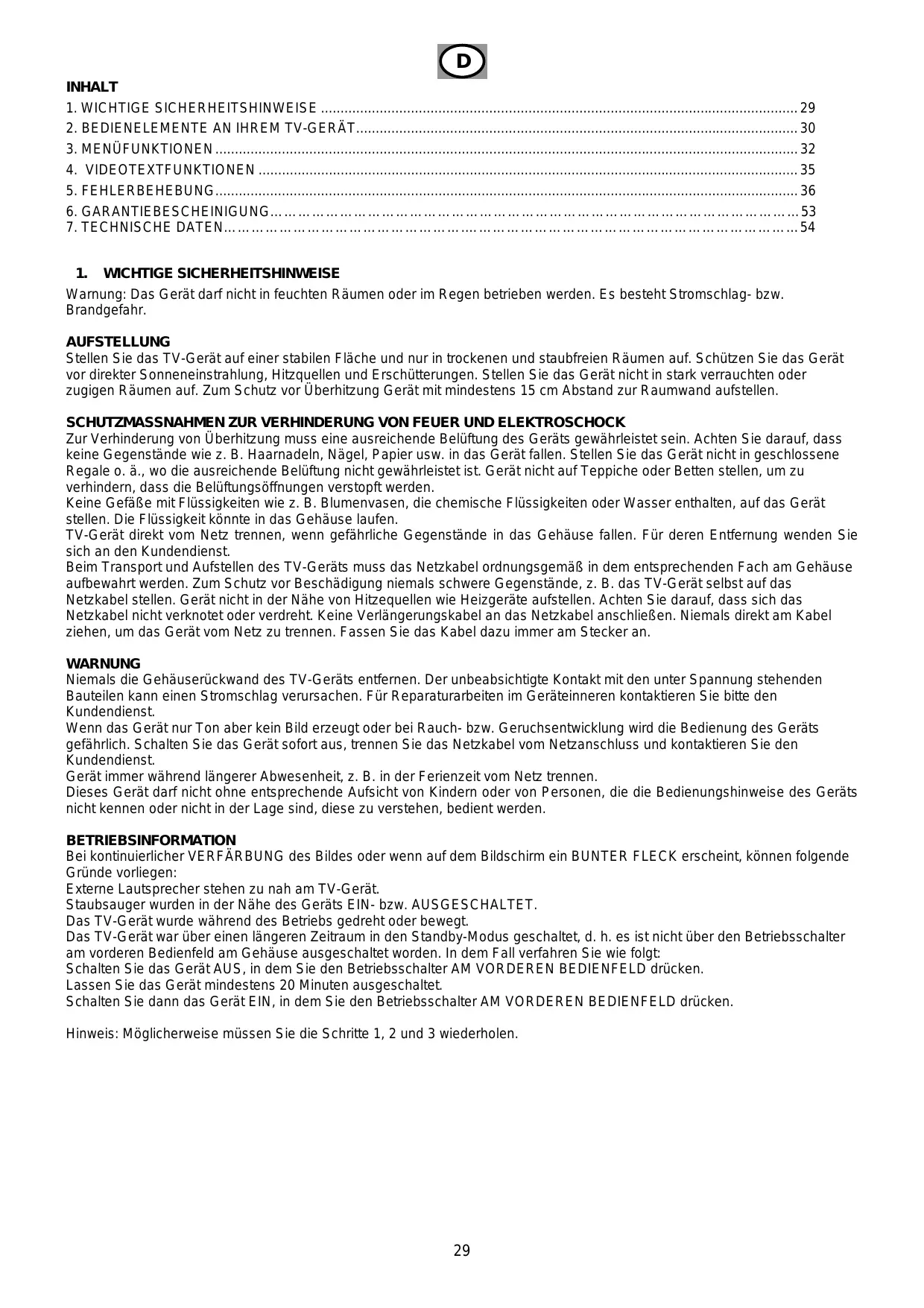Warnung: Das Gerät darf nicht in feuchten Räumen oder im Regen betrieben werden. Es besteht Stromschlag- bzw. Brandgefahr. AUFSTELLUNG Stellen Sie das TV-Gerät auf einer stabilen Fläche und nur in trockenen und staubfreien Räumen auf. Schützen Sie das Gerät vor direkter Sonneneinstrahlung, Hitzquellen und Erschütterungen. Stellen Sie das Gerät nicht in stark verrauchten oder zugigen Räumen auf. Zum Schutz vor Überhitzung Gerät mit mindestens 15 cm Abstand zur Raumwand aufstellen. SCHUTZMASSNAHMEN ZUR VERHINDERUNG VON FEUER UND ELEKTROSCHOCK Zur Verhinderung von Überhitzung muss eine ausreichende Belüftung des Geräts gewährleistet sein. Achten Sie darauf, dass keine Gegenstände wie z. B. Haarnadeln, Nägel, Papier usw. in das Gerät fallen. Stellen Sie das Gerät nicht in geschlossene Regale o. ä., wo die ausreichende Belüftung nicht gewährleistet ist. Gerät nicht auf Teppiche oder Betten stellen, um zu verhindern, dass die Belüftungsöffnungen verstopft werden. Keine Gefäße mit Flüssigkeiten wie z. B. Blumenvasen, die chemische Flüssigkeiten oder Wasser enthalten, auf das Gerät stellen. Die Flüssigkeit könnte in das Gehäuse laufen. TV-Gerät direkt vom Netz trennen, wenn gefährliche Gegenstände in das Gehäuse fallen. Für deren Entfernung wenden Sie sich an den Kundendienst. Beim Transport und Aufstellen des TV-Geräts muss das Netzkabel ordnungsgemäß in dem entsprechenden Fach am Gehäuse aufbewahrt werden. Zum Schutz vor Beschädigung niemals schwere Gegenstände, z. B. das TV-Gerät selbst auf das Netzkabel stellen. Gerät nicht in der Nähe von Hitzequellen wie Heizgeräte aufstellen. Achten Sie darauf, dass sich das Netzkabel nicht verknotet oder verdreht. Keine Verlängerungskabel an das Netzkabel anschließen. Niemals direkt am Kabel ziehen, um das Gerät vom Netz zu trennen. Fassen Sie das Kabel dazu immer am Stecker an. WARNUNG Niemals die Gehäuserückwand des TV-Geräts entfernen. Der unbeabsichtigte Kontakt mit den unter Spannung stehenden Bauteilen kann einen Stromschlag verursachen. Für Reparaturarbeiten im Geräteinneren kontaktieren Sie bitte den Kundendienst. Wenn das Gerät nur Ton aber kein Bild erzeugt oder bei Rauch- bzw. Geruchsentwicklung wird die Bedienung des Geräts gefährlich. Schalten Sie das Gerät sofort aus, trennen Sie das Netzkabel vom Netzanschluss und kontaktieren Sie den Kundendienst. Gerät immer während längerer Abwesenheit, z. B. in der Ferienzeit vom Netz trennen. Dieses Gerät darf nicht ohne entsprechende Aufsicht von Kindern oder von Personen, die die Bedienungshinweise des Geräts nicht kennen oder nicht in der Lage sind, diese zu verstehen, bedient werden. BETRIEBSINFORMATION Bei kontinuierlicher VERFÄRBUNG des Bildes oder wenn auf dem Bildschirm ein BUNTER FLECK erscheint, können folgende Gründe vorliegen: Externe Lautsprecher stehen zu nah am TV-Gerät. Staubsauger wurden in der Nähe des Geräts EIN- bzw. AUSGESCHALTET. Das TV-Gerät wurde während des Betriebs gedreht oder bewegt. Das TV-Gerät war über einen längeren Zeitraum in den Standby-Modus geschaltet, d. h. es ist nicht über den Betriebsschalter am vorderen Bedienfeld am Gehäuse ausgeschaltet worden. In dem Fall verfahren Sie wie folgt: Schalten Sie das Gerät AUS, in dem Sie den Betriebsschalter AM VORDEREN BEDIENFELD drücken. Lassen Sie das Gerät mindestens 20 Minuten ausgeschaltet. Schalten Sie dann das Gerät EIN, in dem Sie den Betriebsschalter AM VORDEREN BEDIENFELD drücken. Hinweis: Möglicherweise müssen Sie die Schritte 1, 2 und 3 wiederholen.