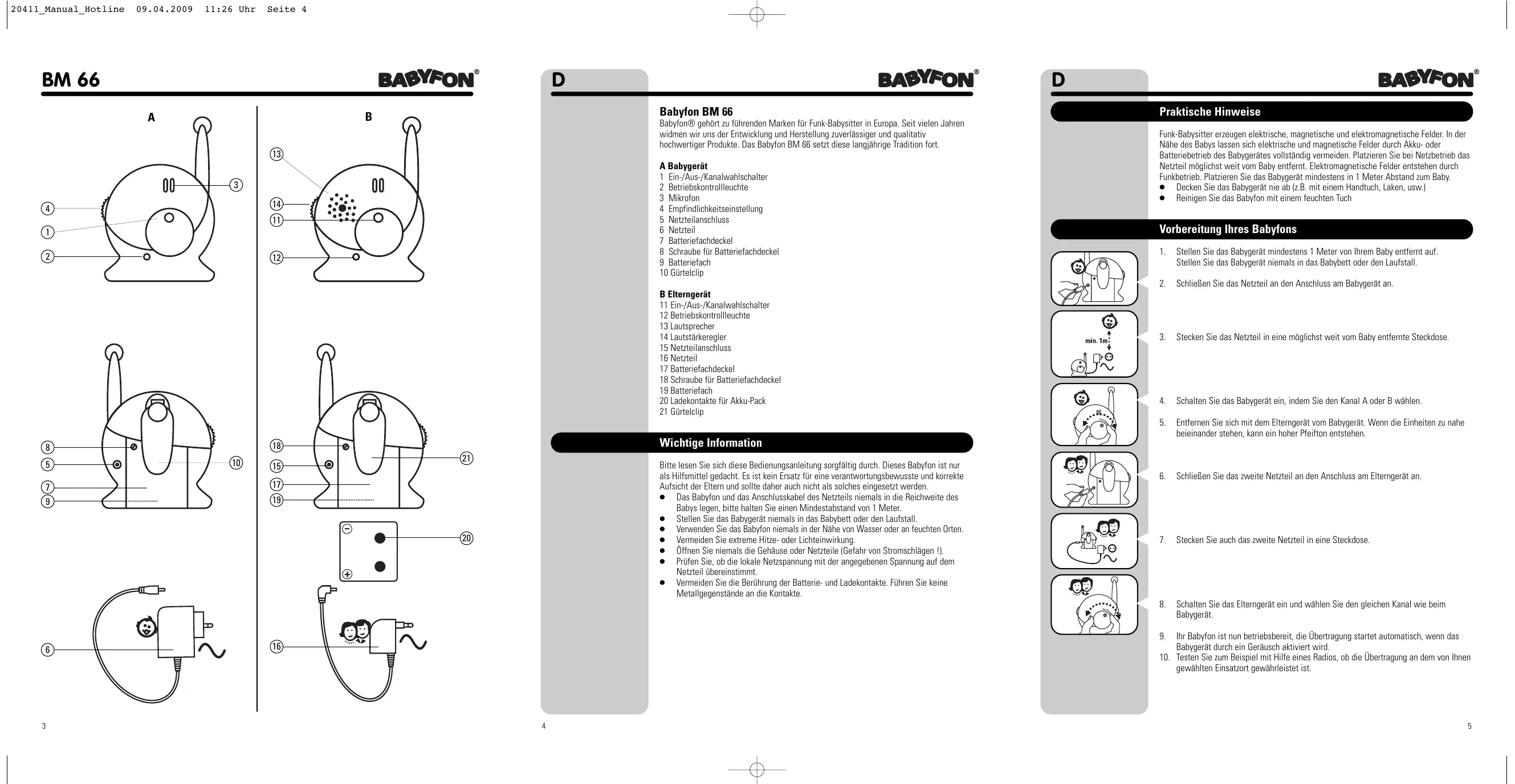 Praktische Hinweise Babyfon® gehört zu führenden Marken für Funk-Babysitter in Europa. Seit vielen Jahren widmen wir uns der Entwicklung und Herstellung zuverlässiger und qualitativ hochwertiger Produkte. Das Babyfon BM 66 setzt diese langjährige Tradition fort. Funk-Babysitter erzeugen elektrische, magnetische und elektromagnetische Felder. In der Nähe des Babys lassen sich elektrische und magnetische Felder durch Akku- oder Batteriebetrieb des Babygerätes vollständig vermeiden. Platzieren Sie bei Netzbetrieb das Netzteil möglichst weit vom Baby entfernt. Elektromagnetische Felder entstehen durch Funkbetrieb. Platzieren Sie das Babygerät mindestens in 1 Meter Abstand zum Baby. ● Decken Sie das Babygerät nie ab (z.B. mit einem Handtuch, Laken, usw.) ● Reinigen Sie das Babyfon mit einem feuchten Tuch