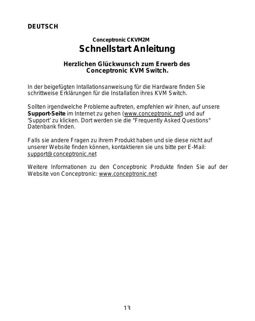 DEUTSCH Conceptronic CKVM2M Schnellstart Anleitung Herzlichen Glückwunsch zum Erwerb des Conceptronic KVM Switch. In der beigefügten Intallationsanweisung für die Hardware finden Sie schrittweise Erklärungen für die Installation ihres KVM Switch. Sollten irgendwelche Probleme auftreten, empfehlen wir ihnen, auf unsere Support-Seite im Internet zu gehen (www.conceptronic.net) und auf 'Support’ zu klicken. Dort werden sie die "Frequently Asked Questions" Datenbank finden. Falls sie andere Fragen zu ihrem Produkt haben und sie diese nicht auf unserer Website finden können, kontaktieren sie uns bitte per E-Mail: support@conceptronic.net Weitere Informationen zu den Conceptronic Produkte finden Sie auf der Website von Conceptronic: www.conceptronic.net