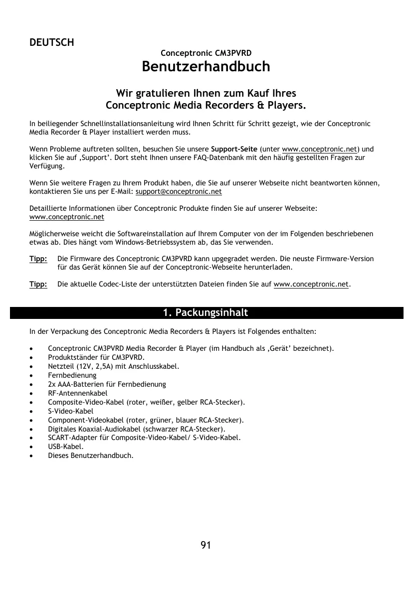DEUTSCH Conceptronic CM3PVRD Benutzerhandbuch Wir gratulieren Ihnen zum Kauf Ihres Conceptronic Media Recorders & Players. In beiliegender Schnellinstallationsanleitung wird Ihnen Schritt für Schritt gezeigt, wie der Conceptronic Media Recorder & Player installiert werden muss. Wenn Probleme auftreten sollten, besuchen Sie unsere Support-Seite (unter www.conceptronic.net) und klicken Sie auf ‚Support’. Dort steht Ihnen unsere FAQ-Datenbank mit den häufig gestellten Fragen zur Verfügung. Wenn Sie weitere Fragen zu Ihrem Produkt haben, die Sie auf unserer Webseite nicht beantworten können, kontaktieren Sie uns per E-Mail: support@conceptronic.net Detaillierte Informationen über Conceptronic Produkte finden Sie auf unserer Webseite: www.conceptronic.net Möglicherweise weicht die Softwareinstallation auf Ihrem Computer von der im Folgenden beschriebenen etwas ab. Dies hängt vom Windows-Betriebssystem ab, das Sie verwenden. Tipp: Die Firmware des Conceptronic CM3PVRD kann upgegradet werden. Die neuste Firmware-Version für das Gerät können Sie auf der Conceptronic-Webseite herunterladen. Tipp: Die aktuelle Codec-Liste der unterstützten Dateien finden Sie auf www.conceptronic.net.