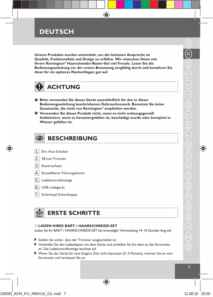 DK I ACHTUNG E Unsere Produkte wurden entwickelt, um die höchsten Ansprüche an Qualität, Funktionalität und Design zu erfüllen. Wir wünschen Ihnen mit Ihrem Remington® Haarschneide-/Rasier-Set viel Freude. Lesen Sie die Bedienungsanleitung vor der ersten Benutzung sorgfältig durch und bewahren Sie diese für ein späteres Nachschlagen gut auf.