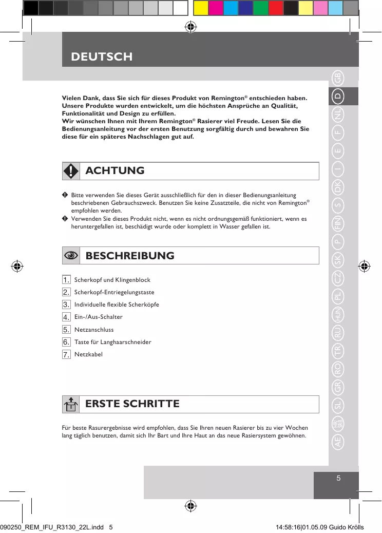 NL F E Vielen Dank, dass Sie sich für dieses Produkt von Remington® entschieden haben. Unsere Produkte wurden entwickelt, um die höchsten Ansprüche an Qualität, Funktionalität und Design zu erfüllen. Wir wünschen Ihnen mit Ihrem Remington® Rasierer viel Freude. Lesen Sie die Bedienungsanleitung vor der ersten Benutzung sorgfältig durch und bewahren Sie diese für ein späteres Nachschlagen gut auf.