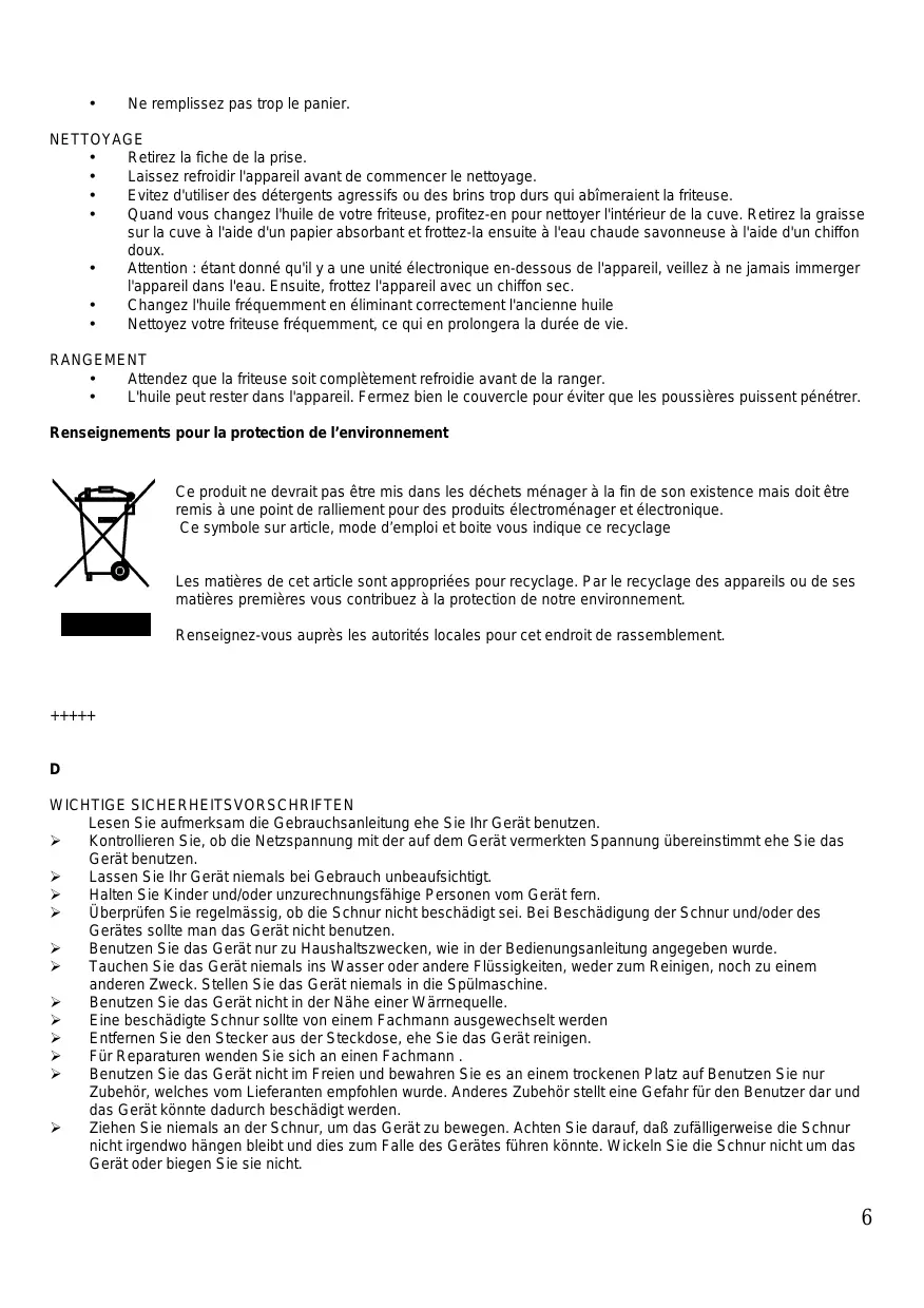 Achten Sie darauf, dass die Nahrung die gleiche Grösse hat, so dass sie gleichmässig fritiert wird. Bestimmte Nahrung wird paniert oder in Teig gerollt. Warten Sie immer bis die Friteuse die gewünschte Temperatur erreicht hat und sich das Lämpchen ausschaltet, ehe Sie Nahrung in die Friteuse geben. Achten Sie darauf, dass Sie den Fritierkorb nicht zu sehr füllen. REINIGEN Ziehen Sie den Stecker aus der Steckdose. Warten Sie bis das Gerät völlig erkaltet ist, ehe Sie es reinigen. Benutzen Sie keine Scheuenmittel oder Topfkratzer, da Ihre Friteuse dadurch beschädigt werden könnte. Reinigen Sie die Aussenseite der Friteuse mit warmem Spülwasser und trocknen Sie das Gerät gut ab. Tauchen Sie die Frieteuse niemals in Wasser oder andere Flüssigkeiten. Wenn Sie das Öl wechseln, giessen Sie das gebrauchte Öl aus und reinigen Sie den Behälter mit Küchenpapier. Spülen Sie dann den Behälter mit warmem Wasser und Spülmittel. Achtung ! Wegen Elektro-Einheit am Boden des Geräts, niemals vollständig in Wasser tauchen. Trocknen Sie den Behälter gut, ehe Sie neues Öl einfüllen. Wechseln Sie das Öl regelmässig und entsorgen Sie es vorschriftsgemäss. Reinigen Sie Ihre Friteuse regelmässig. Dies verlängert die Lebensdauer des Gerätes. AUBEWAHRUNG Warten Sie bis die Friteuse vollständig abgekühlt ist, ehe Sie sie wegstellen. Zur Aufbewahrung kann das Öl in der Friteuse bleiben. Achten Sie darauf, dass der Deckel gut geschlossen bleibt, damit kein Staub in die Friteuse dringen kann. Hinweise zum Umweltschutz Dieses Produkt darf am Ende seiner Lebensdauer nicht über den normalen Haushaltsabfall entsorgt werden, sondern muss an einem Sammelpunkt für das Recycling von elektrischen und elektronischen Geräten abgegeben werden. Das Symbol auf dem Produkt, der Gebrauchsanleitung oder der Verpackung weist darauf hin. Die Werkstoffe sind gemäß ihrer Kennzeichnung wieder verwertbar. Mit der Wiederverwendung, der stofflichen Verwertung oder anderen Formen der Verwertung von Altgeräten leisten Sie einen wichtigen Beitrag zum Schutze unserer Umwelt. Bitte erfragen Sie bei der Gemeindeverwaltung die zuständige Entsorgungsstelle.