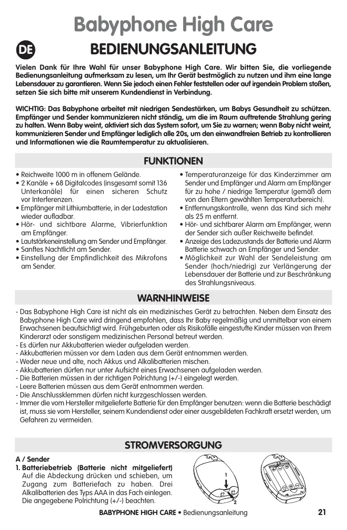 WARNHINWEISE - Das Babyphone High Care ist nicht als ein medizinisches Gerät zu betrachten. Neben dem Einsatz des Babyphone High Care wird dringend empfohlen, dass Ihr Baby regelmäßig und unmittelbar von einem Erwachsenen beaufsichtigt wird. Frühgeburten oder als Risikofälle eingestufte Kinder müssen von Ihrem Kinderarzt oder sonstigem medizinischen Personal betreut werden. - Es dürfen nur Akkubatterien wieder aufgeladen werden. - Akkubatterien müssen vor dem Laden aus dem Gerät entnommen werden. - Weder neue und alte, noch Akkus und Alkalibatterien mischen. - Akkubatterien dürfen nur unter Aufsicht eines Erwachsenen aufgeladen werden. - Die Batterien müssen in der richtigen Polrichtung (+/-) eingelegt werden. - Leere Batterien müssen aus dem Gerät entnommen werden. - Die Anschlussklemmen dürfen nicht kurzgeschlossen werden. - Immer die vom Hersteller mitgelieferte Batterie für den Empfänger benutzen: wenn die Batterie beschädigt ist, muss sie vom Hersteller, seinem Kundendienst oder einer ausgebildeten Fachkraft ersetzt werden, um Gefahren zu vermeiden.