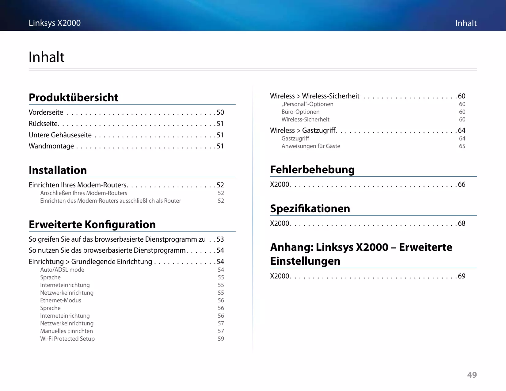 Laden Sie die Anleitung für Ihr Router kostenlos im PDF-Format! Finden Sie Ihr Handbuch X3000 - LINKSYS und nehmen Sie Ihr elektronisches Gerät wieder in die Hand. Auf dieser Seite sind alle Dokumente veröffentlicht, die für die Verwendung Ihres Geräts notwendig sind. X3000 von der Marke LINKSYS.
