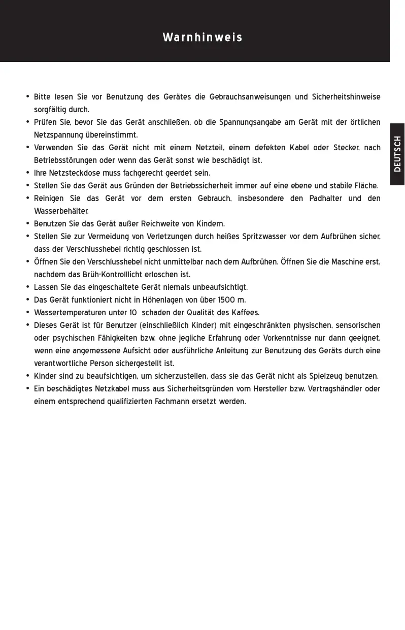 • N’utilisez pas cet appareil avec un adaptateur ou un cordon électrique endommagé, ou en cas de dysfonctionnement, quel qu’en soit l’origine. • La prise d’alimentation doit être munie d’une connexion à la terre. • L’appareil doit être disposé sur une surface plate et horizontale. Ne pas le déposer sur une surface inclinée ou instable afin d’éviter tout risque d’accident. • Avant la première utilisation, nettoyez l’appareil, en particulier le support à capsule et le réservoir d’eau. • En cours d’utilisation, veillez à ce que l’appareil soit hors de portée d’enfants. • Avant de faire passer le café, veillez à ce que le levier soit verrouillé afin d’éviter d’être blessé par des projections d’eau chaude. • Ne pas soulever le levier sitôt le café passé mais une fois que la veilleuse s’éteint. • Ne pas laisser l’appareil sans surveillance en cours d’utilisation. • L’appareil ne fonctionne pas à une altitude supérieure à 1500 mètres. • Utilisez une eau ≥10℃ pour une meilleure qualité de café. • Cet appareil n’est pas conçu pour être utilisé par des personnes (y compris des enfants) ayant des capacités sensorielles ou mentales limitées, inexpérimentées ou ignorantes, sauf si elles ont été informées du fonctionnement de l’appareil ou sous la surveillance d’une personne responsable de leur sécurité. • Surveillez les enfants afin d’éviter qu’ils ne jouent avec l’appareil. • Si le cordon d’alimentation est endommagé, il doit être remplacé par le fabricant, le SAV ou un technicien agréé afin d’éviter tout risque d’accident.