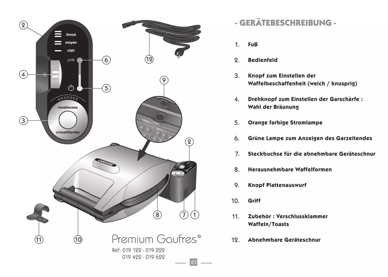 - Knopf zum Einstellen der Waffelbeschaffenheit (weich / knusprig) Ref 010122: Platten für Maxiwaffeln (5x8) Ref. 010222: Platten für Waffeln Ref. 010422: Platten für Toasts Position normale Waffeln Ref: 010122 Platten für Maxiwaffeln (5x8) Position knusprige Waffeln