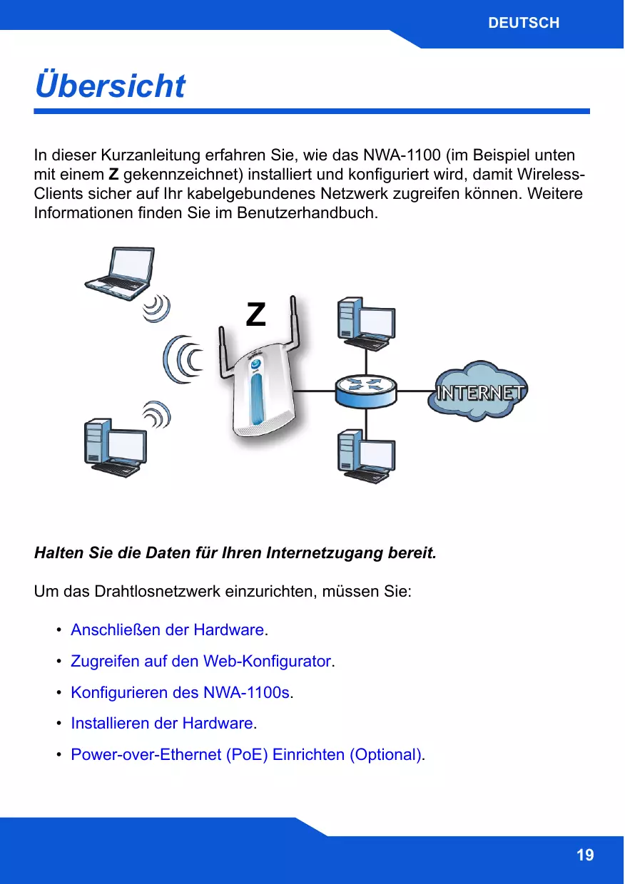Z Halten Sie die Daten für Ihren Internetzugang bereit. Um das Drahtlosnetzwerk einzurichten, müssen Sie: • Anschließen der Hardware. • Zugreifen auf den Web-Konfigurator. • Konfigurieren des NWA-1100s. • Installieren der Hardware. • Power-over-Ethernet (PoE) Einrichten (Optional).