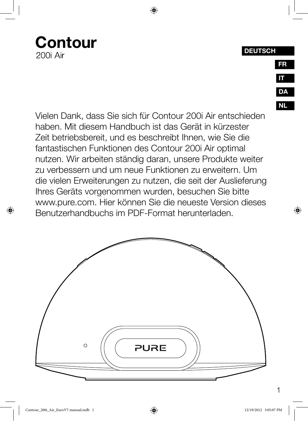 12/19/2012 3:05:07 PM DEUTSCH FR ES IT DA ES NL Vielen Dank, dass Sie sich für Contour 200i Air entschieden haben. Mit diesem Handbuch ist das Gerät in kürzester Zeit betriebsbereit, und es beschreibt Ihnen, wie Sie die fantastischen Funktionen des Contour 200i Air optimal nutzen. Wir arbeiten ständig daran, unsere Produkte weiter zu verbessern und um neue Funktionen zu erweitern. Um die vielen Erweiterungen zu nutzen, die seit der Auslieferung Ihres Geräts vorgenommen wurden, besuchen Sie bitte www.pure.com. Hier können Sie die neueste Version dieses Benutzerhandbuchs im PDF-Format herunterladen.