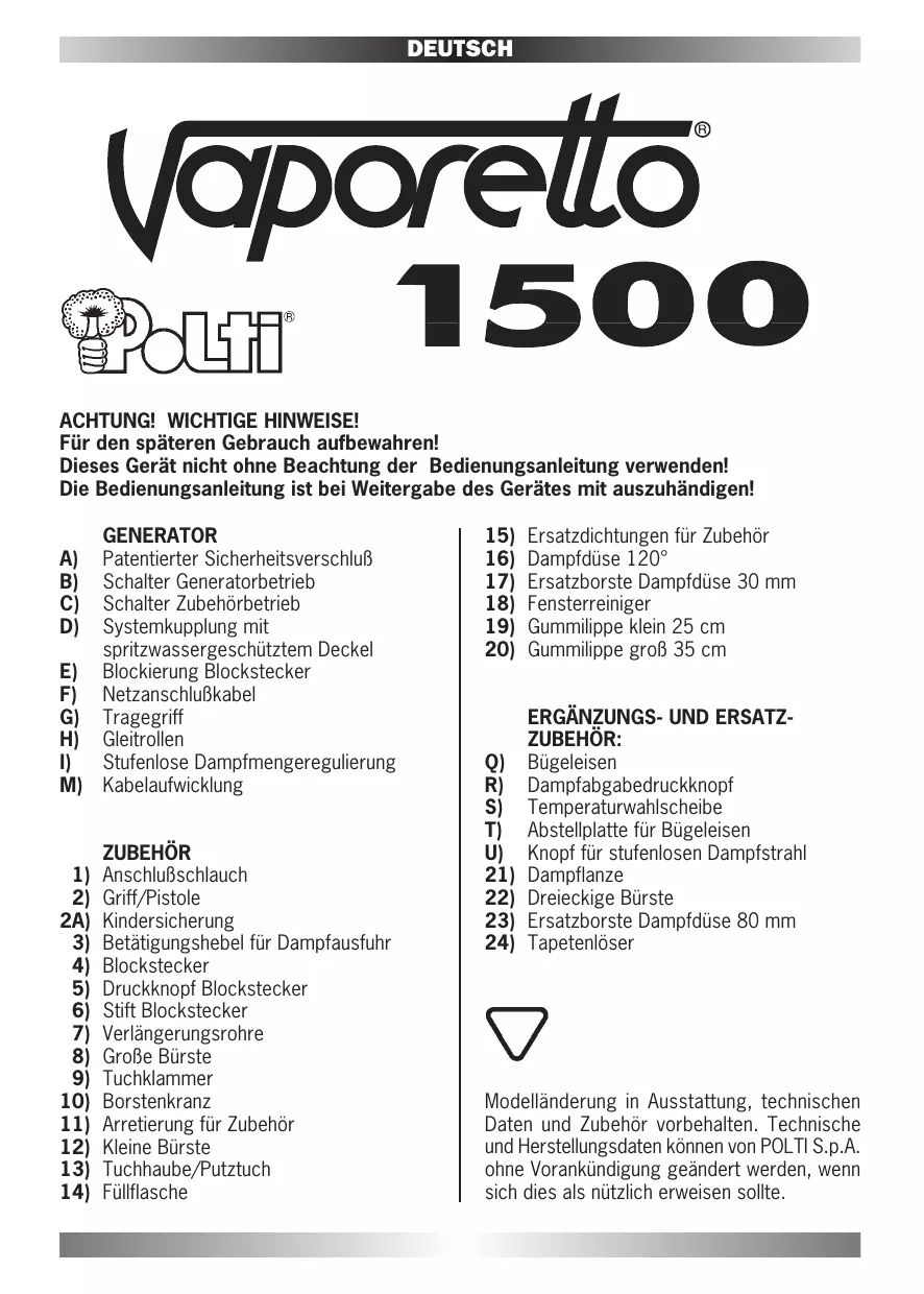 1500 - Dampfreiniger VAPORETTO - Kostenlose Bedienungsanleitung