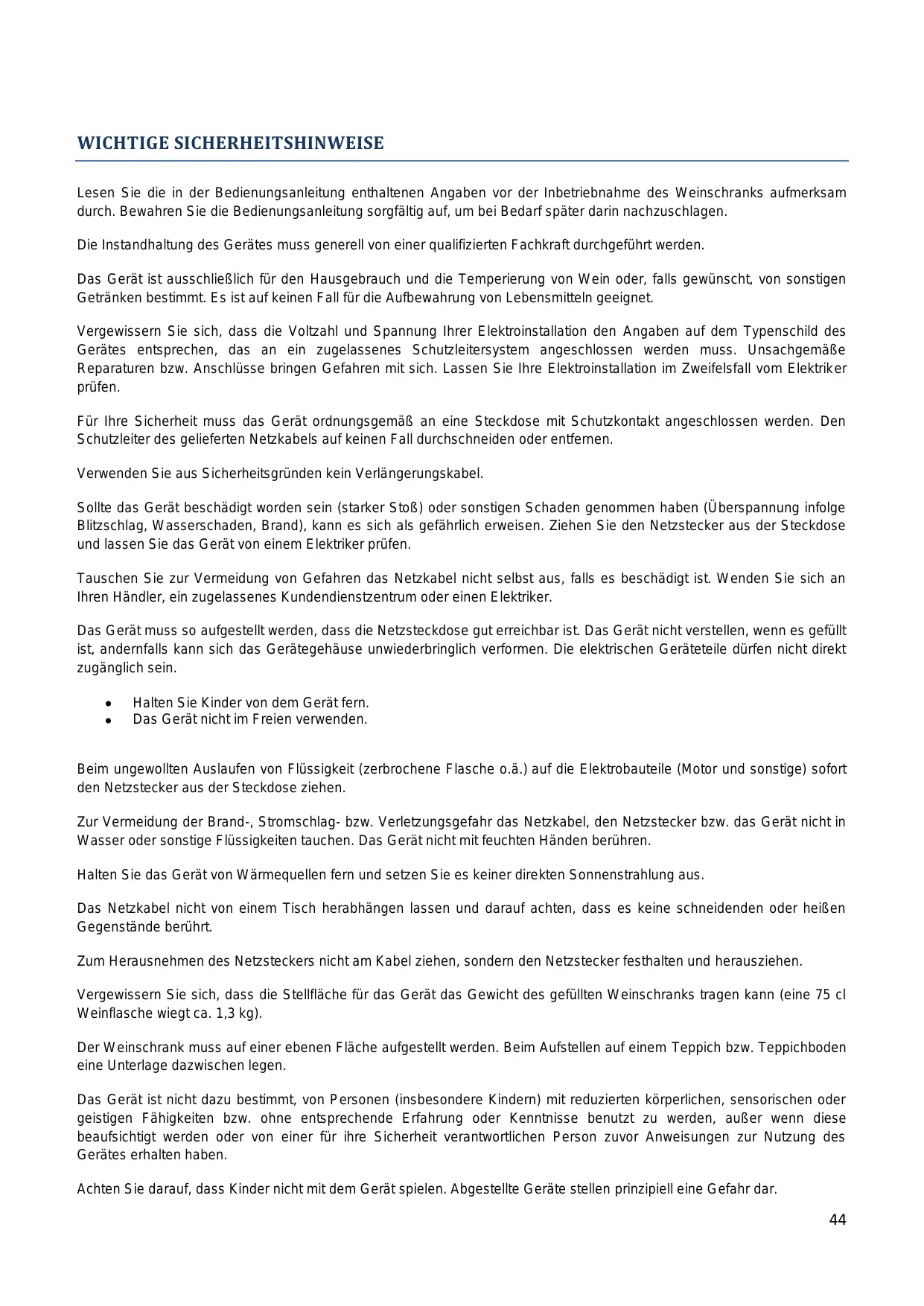 Das Gerät ist ausschließlich für den Hausgebrauch und die Temperierung von Wein oder, falls gewündt, von sonstigen Geträken bestimmt. Es ist auf keinen Fall für die Aufbewährung von Lebensmitteln geeignet.