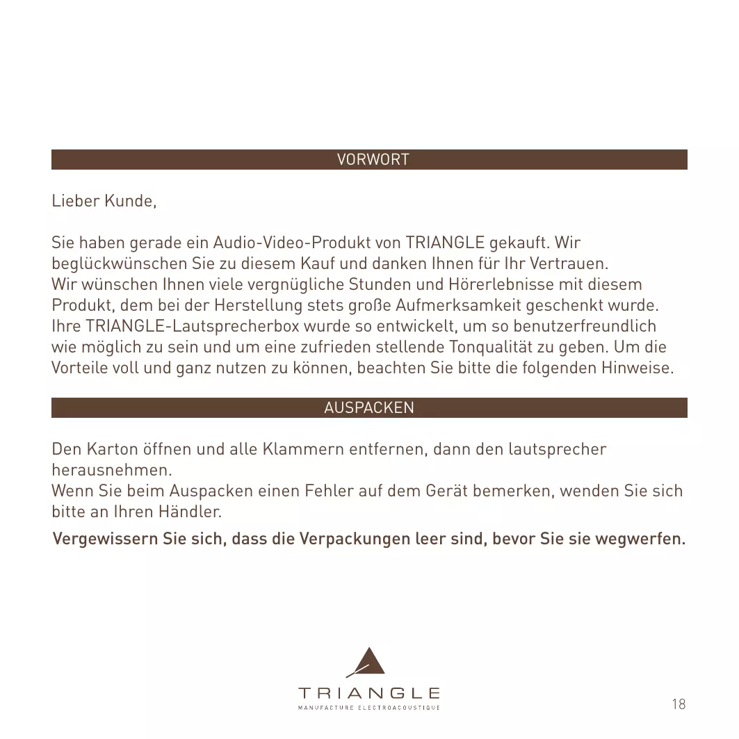 Sie haben gerade ein Audio-Video-Produkt von TRIANGLE gekauft. Wir beglückwūnschen Sie zu diesen Kauf und danken Ihnen für Ihr Vertrauen. Wir wūnschen Ihnen viele vergnugliche Stunden und Hörerlebnisse mit diesen Produkt, dem bei der Herstellung stets große Aufmerksamkeit geschenkt wurde. Ihr TRIANGLE-Lautsprecherbox wurde so entwickelt, um so benutzerfreundlich wie möglich zu sein und um eine zufriedenstellende Tonqualität zu geben. Um die Vorteile voll und ganz nutzen zu konnen, beachten Sieitte die folgenden Hinweise.