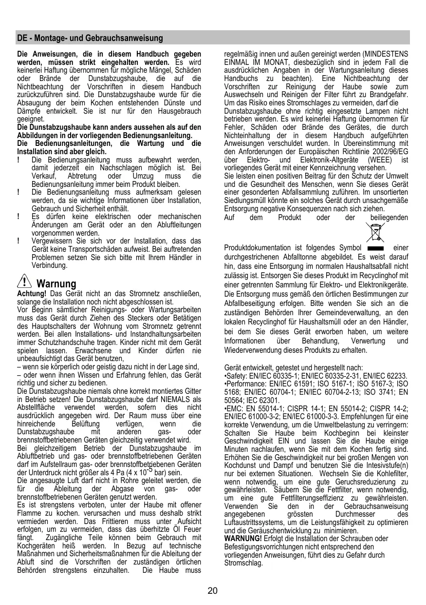 DE - Montage- und Gebrauchsanweisung Die Anweisungen, die in diesem Handbuch gegeben werden, müssen strikt eingehalten werden. Es wird keinerlei Haftung übernommen für mögliche Mängel, Schäden oder Brände der Dunstabzugshaube, die auf die Nichtbeachtung der Vorschriften in diesem Handbuch zurückzuführen sind. Die Dunstabzugshaube wurde für die Absaugung der beim Kochen entstehenden Dünste und Dämpfe entwickelt. Sie ist nur für den Hausgebrauch geeignet. Die Dunstabzugshaube kann anders aussehen als auf den Abbildungen in der vorliegenden Bedienungsanleitung. Die Bedienungsanleitungen, die Wartung und die Installation sind aber gleich. Die Bedienungsanleitung muss aufbewahrt werden, damit jederzeit ein Nachschlagen möglich ist. Bei Verkauf, Abtretung oder Umzug muss die Bedienungsanleitung immer beim Produkt bleiben. Die Bedienungsanleitung muss aufmerksam gelesen werden, da sie wichtige Informationen über Installation, Gebrauch und Sicherheit enthält. Es dürfen keine elektrischen oder mechanischen Änderungen am Gerät oder an den Abluftleitungen vorgenommen werden. Vergewissern Sie sich vor der Installation, dass das Gerät keine Transportschäden aufweist. Bei auftretenden Problemen setzen Sie sich bitte mit Ihrem Händler in Verbindung. regelmäßig innen und außen gereinigt werden (MINDESTENS EINMAL IM MONAT, diesbezüglich sind in jedem Fall die ausdrücklichen Angaben in der Wartungsanleitung dieses Handbuchs zu beachten). Eine Nichtbeachtung der Vorschriften zur Reinigung der Haube sowie zum Auswechseln und Reinigen der Filter führt zu Brandgefahr. Um das Risiko eines Stromschlages zu vermeiden, darf die Dunstabzugshaube ohne richtig eingesetzte Lampen nicht betrieben werden. Es wird keinerlei Haftung übernommen für Fehler, Schäden oder Brände des Gerätes, die durch Nichteinhaltung der in diesem Handbuch aufgeführten Anweisungen verschuldet wurden. In Übereinstimmung mit den Anforderungen der Europäischen Richtlinie 2002/96/EG über Elektro- und Elektronik-Altgeräte (WEEE) ist vorliegendes Gerät mit einer Kennzeichnung versehen. Sie leisten einen positiven Beitrag für den Schutz der Umwelt und die Gesundheit des Menschen, wenn Sie dieses Gerät einer gesonderten Abfallsammlung zuführen. Im unsortierten Siedlungsmüll könnte ein solches Gerät durch unsachgemäße Entsorgung negative Konsequenzen nach sich ziehen. Auf dem Produkt oder der beiliegenden einer Produktdokumentation ist folgendes Symbol durchgestrichenen Abfalltonne abgebildet. Es weist darauf hin, dass eine Entsorgung im normalen Haushaltsabfall nicht zulässig ist. Entsorgen Sie dieses Produkt im Recyclinghof mit einer getrennten Sammlung für Elektro- und Elektronikgeräte. Die Entsorgung muss gemäß den örtlichen Bestimmungen zur Abfallbeseitigung erfolgen. Bitte wenden Sie sich an die zuständigen Behörden Ihrer Gemeindeverwaltung, an den lokalen Recyclinghof für Haushaltsmüll oder an den Händler, bei dem Sie dieses Gerät erworben haben, um weitere Informationen über Behandlung, Verwertung und Wiederverwendung dieses Produkts zu erhalten. Warnung Achtung! Das Gerät nicht an das Stromnetz anschließen, solange die Installation noch nicht abgeschlossen ist. Vor Beginn sämtlicher Reinigungs- oder Wartungsarbeiten muss das Gerät durch Ziehen des Steckers oder Betätigen des Hauptschalters der Wohnung vom Stromnetz getrennt werden. Bei allen Installations- und Instandhaltungsarbeiten immer Schutzhandschuhe tragen. Kinder nicht mit dem Gerät spielen lassen. Erwachsene und Kinder dürfen nie unbeaufsichtigt das Gerät benutzen, – wenn sie körperlich oder geistig dazu nicht in der Lage sind, – oder wenn ihnen Wissen und Erfahrung fehlen, das Gerät richtig und sicher zu bedienen. Die Dunstabzugshaube niemals ohne korrekt montiertes Gitter in Betrieb setzen! Die Dunstabzugshaube darf NIEMALS als Abstellfläche verwendet werden, sofern dies nicht ausdrücklich angegeben wird. Der Raum muss über eine hinreichende Belüftung verfügen, wenn die Dunstabzugshaube mit anderen gasoder brennstoffbetriebenen Geräten gleichzeitig verwendet wird. Bei gleichzeitigem Betrieb der Dunstabzugshaube im Abluftbetrieb und gas- oder brennstoffbetriebenen Geräten darf im Aufstellraum gas- oder brennstoffbetriebenen Geräten der Unterdruck nicht größer als 4 Pa (4 x 10-5 bar) sein. Die angesaugte Luft darf nicht in Rohre geleitet werden, die für die Ableitung der Abgase von gas- oder brennstoffbetriebenen Geräten genutzt werden. Es ist strengstens verboten, unter der Haube mit offener Flamme zu kochen. verursachen und muss deshalb strikt vermieden werden. Das Frittieren muss unter Aufsicht erfolgen, um zu vermeiden, dass das überhitzte Öl Feuer fängt. Zugängliche Teile können beim Gebrauch mit Kochgeräten heiß werden. In Bezug auf technische Maßnahmen und Sicherheitsmaßnahmen für die Ableitung der Abluft sind die Vorschriften der zuständigen örtlichen Behörden strengstens einzuhalten. Die Haube muss Gerät entwickelt, getestet und hergestellt nach: