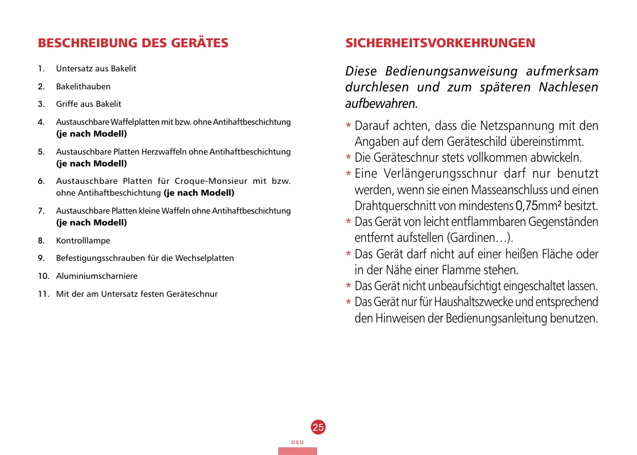 Befestigungsschrauben für die Wechselplatten SICHERHEITSVORKEHRUNGEN Diese Bedienungsanweisung aufmerksam durchlesen und zum späteren Nachlesen aufbewahren. **Darauf achten, dass die Netzspannung mit den Angaben auf dem Geräteschild übereinstimmt. **Die Geräteschnur stets vollkommen abwickeln. **Eine Verlängerungsschnur darf nur benutzt werden, wenn sie einen Masseanschluss und einen Drahtquerschnitt von mindestens 0,75mm² besitzt. **Das Gerät von leicht entflammbaren Gegenständen entfernt aufstellen (Gardinen…). **Das Gerät darf nicht auf einer heißen Fläche oder in der Nähe einer Flamme stehen. **Das Gerät nicht unbeaufsichtigt eingeschaltet lassen. **Das Gerät nur für Haushaltszwecke und entsprechend den Hinweisen der Bedienungsanleitung benutzen.