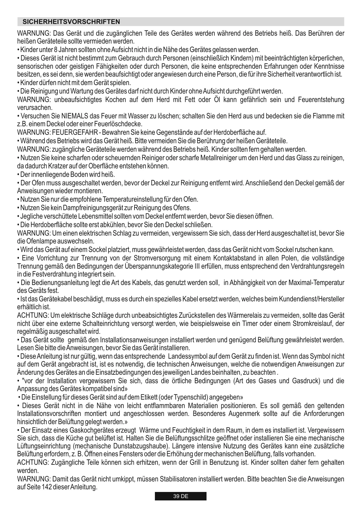 - Dieses Gerätarf nur für die ausgelegten Zwecke, d. h. nur zum Kochen, Braten und Backen von Speisen verwendet werden. Jede andere Benutzung des Gerats, z. B. zum Beheizen des Raumes, ist eine missbrächliche Verwendung, durch die Gefahren entstehen konnen.