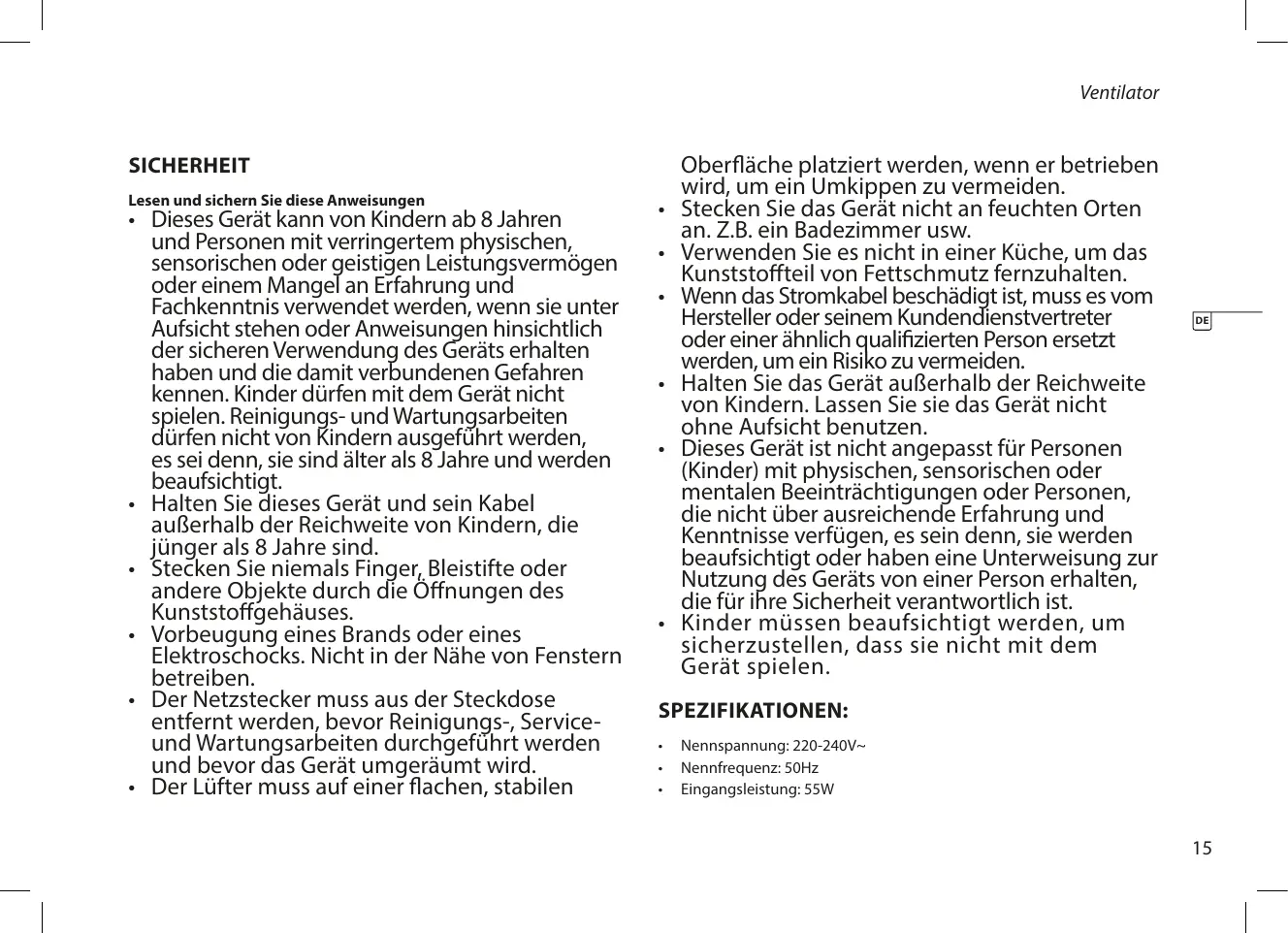 Oberfläche platziert werden, wenn er betrieben wird, um ein Umkippen zu vermeiden. Stecken Sie das Gerät nicht an feuchten Orten an. Z.B. ein Badezimmer usw. Verwenden Sie es nicht in einer Küche, um das Kunststoffteil von Fettschmutz fernzuhalten. Wenn das Stromkabel beschädigt ist, muss es vom Hersteller oder seinem Kundendienstvertreter oder einer ähnlich qualifizierten Person ersetzt werden, um ein Risiko zu vermeiden. Halten Sie das Gerät außerhalb der Reichweite von Kindern. Lassen Sie sie das Gerät nicht ohne Aufsicht benutzen. Dieses Gerät ist nicht angepasst für Personen (Kinder) mit physischen, sensorischen oder mentalen Beeinträchtigungen oder Personen, die nicht über ausreichende Erfahrung und Kenntnisse verfügen, es sein denn, sie werden beaufsichtigt oder haben eine Unterweisung zur Nutzung des Geräts von einer Person erhalten, die für ihre Sicherheit verantwortlich ist. Kinder müssen beaufsichtigt werden, um sicherzustellen, dass sie nicht mit dem Gerät spielen.