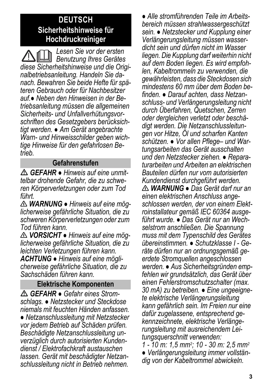 10 - 30 m : 2,5 mm2 ● Toujours dérouler entièrement les rallonges de l’enrouleur de câble. Manipulation fiable DANGER ● L’utilisateur doit utiliser l’appareil de façon conforme. Il doit prendre en considération les données locales et lors du maniement de l’appareil, il doit prendre garde aux tierces personnes, et en particulier aux enfants. ● Avant toute utilisation, vérifier l'état des composants importants, comme le flexible haute pression, la poignée pistolet et les dispositifs de sécurité. Remplacer immédiatement les composants endommagés. Ne pas mettre en service un appareil avec des composants endommagés. ● Une utilisation incorrecte des jets haute pression peut présenter des dangers. Le jet ne doit pas être dirigé sur des personnes, des animaux, des installations électriques actives ni sur l'appareil lui-même. ● Ne jamais diriger le jet haute pression sur soi-même ni sur d’autres personnes dans le but de nettoyer les vêtements ou les chaussures. ● Le jet haute pression risque d’endommager les pneus/valves de véhicules et les pneus risquent d’éclater. Le premier indice d’endommagement est une décoloration du pneu. Des pneus/valves de véhicules endommagés présentent des dangers de mort. Il faut toujours se tenir