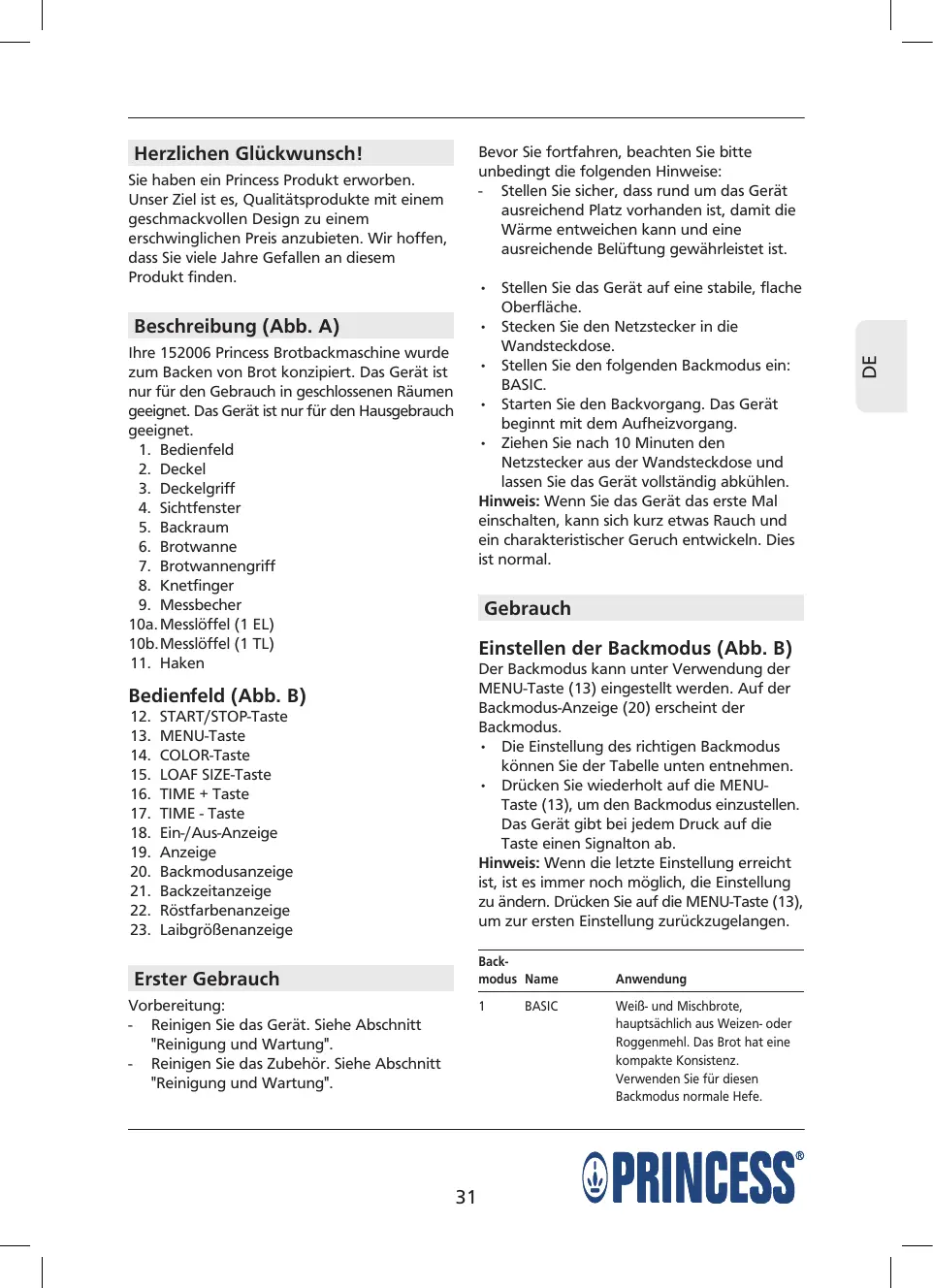 152009 - PRINCESS - Kostenlose Bedienungsanleitung